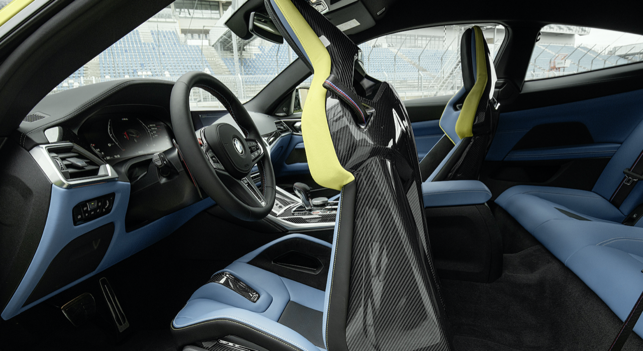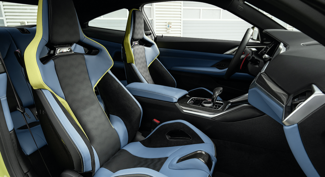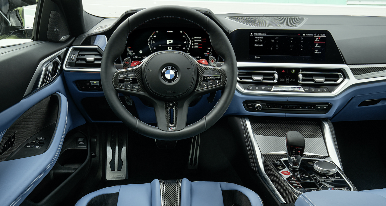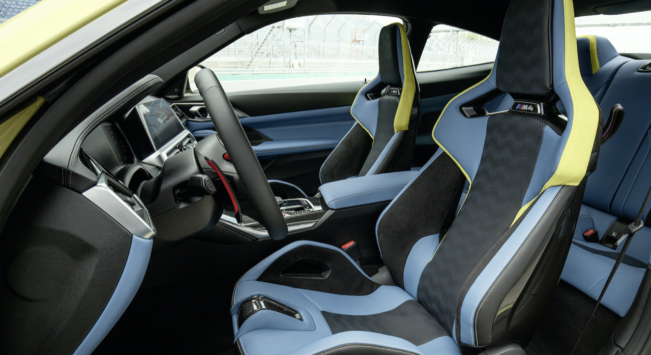 ห้องโดยสารของ M Car รุ่นใหม่ M4 Competition Coupé มีเบาะนั่งที่สวยงาม ตกแต่งด้วยลวดลายเส้นสายในสไตล์ M โดยเน้นไปที่คนขับซึ่งเป็นจุดศูนย์กลางของการใช้งานอุปกรณ์ต่างๆ M4 Competition Coupé มาพร้อมเบาะนั่ง M carbon ทรง Sport bucket ควบรวมรูปแบบเบาะที่นั่งของรถแข่ง ผนวกกับโครงสร้างคาร์บอนน้ำหนักเบาของตัวเบาะ ออกแบบสำหรับการขับขี่ระยะไกลทั้งบนไฮเวย์และในสนามแข่ง รายละเอียดของการตัดเย็บตะเข็บที่ใช้ตกแต่งเบาะ คอนโซล แผงประตู แสดงถึงความประณีตบรรจงของช่างฝีมือผู้เชี่ยวชาญ พนักพิงศีรษะที่สามารถถอดเก็บได้สำหรับการขับขี่ในสนามแข่ง ซึ่งต้องใส่หมวกกันน็อก พนักพิงแบบถอดได้ช่วยทำให้เกิดท่านั่งที่ดีขึ้นเมื่อใส่หมวกกันน็อกในสนามแข่ง ทำให้ช่วงคอของคนขับอยู่ในลักษณะที่ตั้งตรง ตราสัญลักษณ์ M เรืองแสง สามารถปรับไฟฟ้าได้ เข็มขัดนิรภัยออกแบบให้รองรับการยึดแบบหลายจุด เพื่อเสริมความปลอดภัย ปุ่ม M Mode บริเวณคอนโซลกลาง ใช้สำหรับตั้งค่าการตอบสนองและรูปแบบของระบบช่วยเหลือผู้ขับขี่ต่างๆ ส่วนมาตรวัดและจอ BMW Head-up Display แสดงข้อมูลระหว่างการขับขี่ในสภาวะต่างๆ ตามสไตล์ M นอกจากนี้ ยังมีโหมดการขับขี่ได้ 3 รูปแบบ ได้แก่ ROAD, SPORT และ TRACK สำหรับการขับบนถนนปกติหรือในสนามแข่ง
