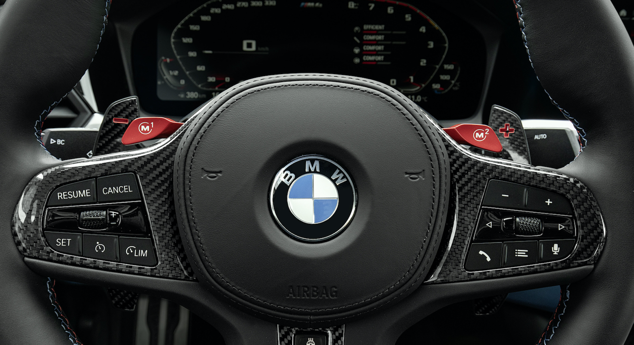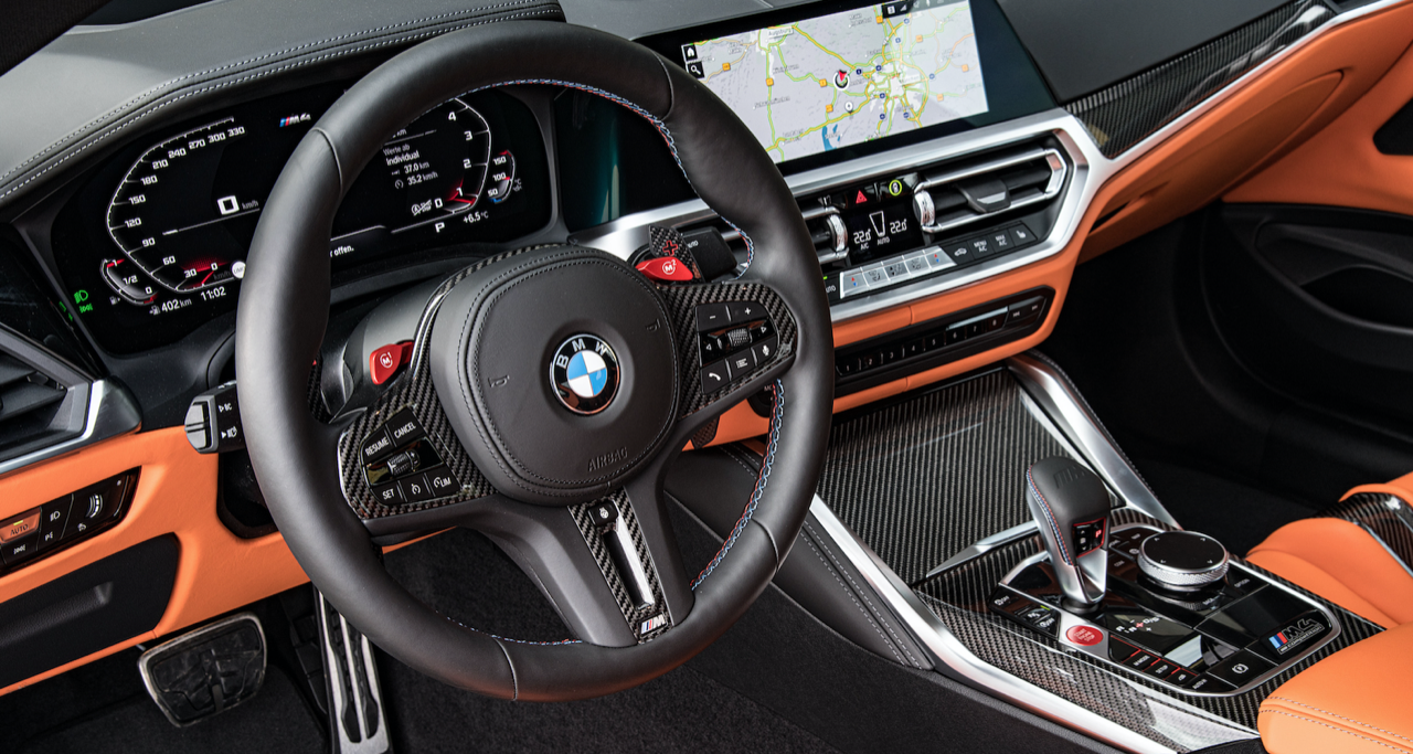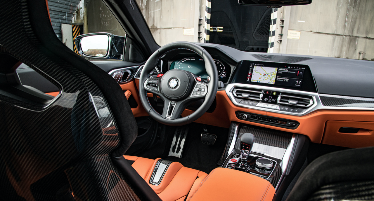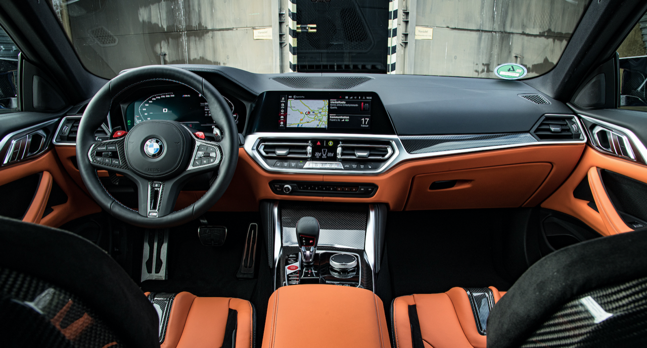 ห้องโดยสารของ M Car รุ่นใหม่ M4 Competition Coupé มีเบาะนั่งที่สวยงาม ตกแต่งด้วยลวดลายเส้นสายในสไตล์ M โดยเน้นไปที่คนขับซึ่งเป็นจุดศูนย์กลางของการใช้งานอุปกรณ์ต่างๆ M4 Competition Coupé มาพร้อมเบาะนั่ง M carbon ทรง Sport bucket ควบรวมรูปแบบเบาะที่นั่งของรถแข่ง ผนวกกับโครงสร้างคาร์บอนน้ำหนักเบาของตัวเบาะ ออกแบบสำหรับการขับขี่ระยะไกลทั้งบนไฮเวย์และในสนามแข่ง รายละเอียดของการตัดเย็บตะเข็บที่ใช้ตกแต่งเบาะ คอนโซล แผงประตู แสดงถึงความประณีตบรรจงของช่างฝีมือผู้เชี่ยวชาญ พนักพิงศีรษะที่สามารถถอดเก็บได้สำหรับการขับขี่ในสนามแข่ง ซึ่งต้องใส่หมวกกันน็อก พนักพิงแบบถอดได้ช่วยทำให้เกิดท่านั่งที่ดีขึ้นเมื่อใส่หมวกกันน็อกในสนามแข่ง ทำให้ช่วงคอของคนขับอยู่ในลักษณะที่ตั้งตรง ตราสัญลักษณ์ M เรืองแสง สามารถปรับไฟฟ้าได้ เข็มขัดนิรภัยออกแบบให้รองรับการยึดแบบหลายจุด เพื่อเสริมความปลอดภัย ปุ่ม M Mode บริเวณคอนโซลกลาง ใช้สำหรับตั้งค่าการตอบสนองและรูปแบบของระบบช่วยเหลือผู้ขับขี่ต่างๆ ส่วนมาตรวัดและจอ BMW Head-up Display แสดงข้อมูลระหว่างการขับขี่ในสภาวะต่างๆ ตามสไตล์ M นอกจากนี้ ยังมีโหมดการขับขี่ได้ 3 รูปแบบ ได้แก่ ROAD, SPORT และ TRACK สำหรับการขับบนถนนปกติหรือในสนามแข่ง