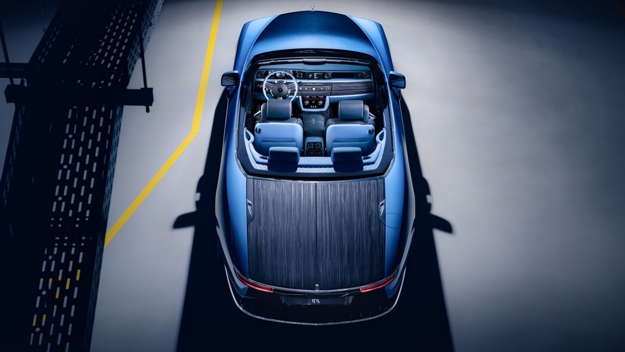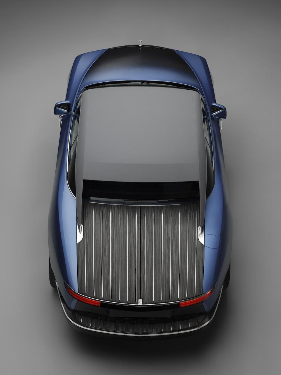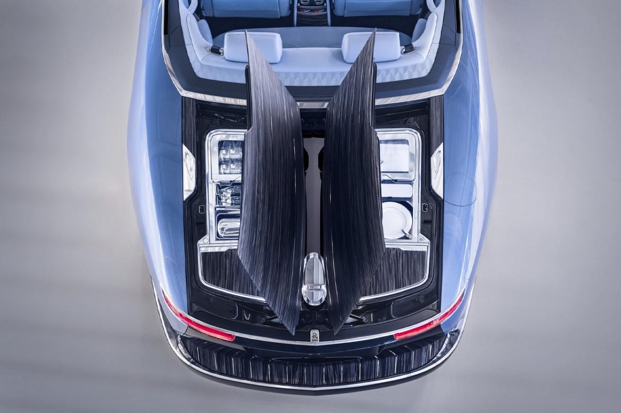 Rolls-Royce Boat Tail ออกแบบส่วนท้ายใหม่ บริเวณที่เก็บหลังคาซ่อนแนวคิดอันท้าทายแบบที่ไม่เคยปรากฏมาก่อนในโลกยานยนต์ เมื่อกดปุ่มเปิด ระบบฝาท้ายไฟฟ้าจะถูกเปิดออกในลักษณะของปีกผีเสื้อ เผยโฉมบริเวณที่มีความซับซ้อนและกว้างขวาง สำหรับการเลี้ยงรับรอง การเคลื่อนไหวที่ซับซ้อนของกลไกเปิด-ปิดฝาท้าย ได้รับแรงบันดาลใจจากแนวคิดของโครงสร้างคานยื่น จากสถาปนิกชื่อดัง Santiago Calatrava
