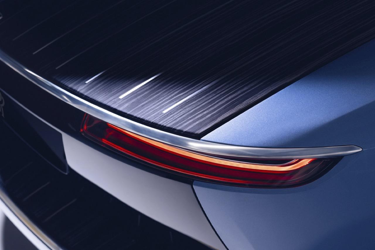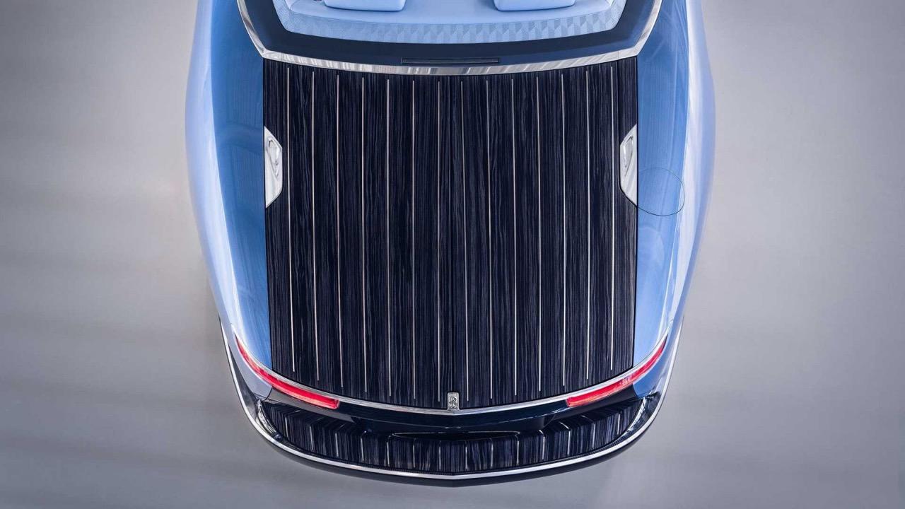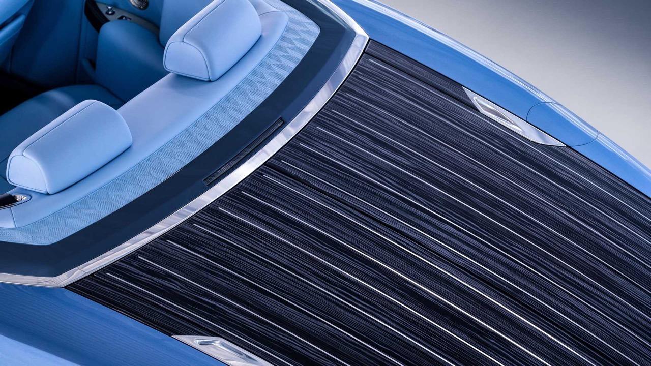 ส่วนท้ายรถมีรายละเอียดงานออกแบบเกี่ยวกับเรือที่เด่นชัดมากขึ้น ส่วนท้ายเรือในอดีต ใช้ไม้ในการผลิต ที่เก็บหลังคาด้านหลังของ Boat Tail ถูกตีความหมายใหม่ให้ทันสมัย ด้วยการใช้ไม้แผ่นใหญ่ แผงไม้วีเนียร์ Caleidolegno ถูกใช้เพื่อความกลมกลืนกับโครงสร้างทางวิศวกรรม วัสดุไม้สีเทาและดำ ถูกใช้สำหรับงานภายใน ถูกปรับใช้สำหรับงานตกแต่งภายนอก วัสดุไม้แบบรูพรุนเปิดช่วยให้เห็นเส้นลายไม้ ตัดกับเหล็กกล้าไร้สนิมขัดเงาที่ฝังด้านข้างตามแนวยาว โชว์ให้เห็นถึงวิธีการผสมผสานการใช้ไม้ในการสร้างเรือยอร์ชทั้งแบบเก่า และแบบใหม่ ทักษะของผู้เชี่ยวชาญด้านไม้ การจับคู่ลายไม้ให้สมส่วน เข้ากับตัวถังทุกจุด ไม้วีเนียร์ถูกใช้ตกแต่งส่วนท้ายรถแนวขวาง แก้ปัญหาเรื่องน้ำหนักของส่วนท้าย ทำให้นึกถึงเส้นของโครงสร้างรถคลาสสิก Rolls Royce Boat Tail ในอดีต