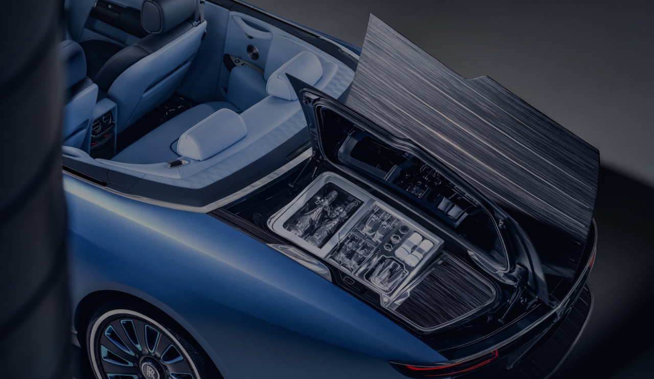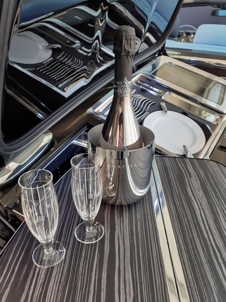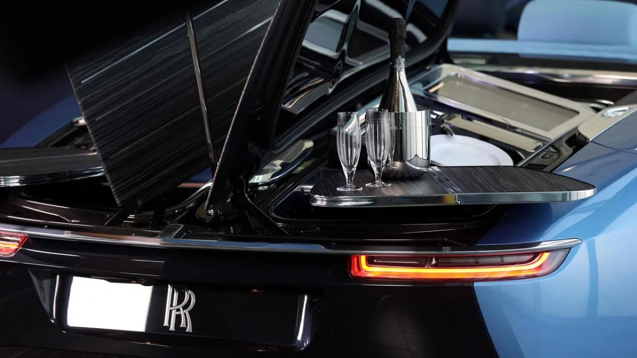 กล่องเก็บของถูกออกแบบให้เหมือนกับหีบสมบัติ เพื่อความสมบูรณ์แบบสำหรับประสบการณ์การรับประทานอาหารกลางแจ้ง ในแบบฉบับของ Rolls Royce โดยด้านหนึ่งสำหรับการดื่มเรียกน้ำย่อยก่อนอาหาร ส่วนอีกด้านสำหรับการจัดวางอาหาร เครื่องใช้บนโต๊ะอาหารที่แกะสลักชื่อ ‘Boat Tail’ ถูกผลิตโดย Christofle ในกรุงปารีส ตู้แช่เย็นคู่ ถูกพัฒนาขึ้นสำหรับ Armand de Brignac แชมเปญวินเทจของลูกค้าถูกเก็บอย่างดี ช่องด้านในออกแบบพิเศษเฉพาะ สำหรับขนาดขวดแชมเปญ ตกแต่งอย่างงดงามด้วยการขัดเงา และใช้สีที่เข้ากับสีขวดของแชมเปญ