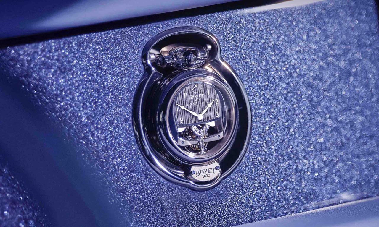 ทีมช่างหัตถศิลป์ระดับโลกจาก House of BOVET 1822 แบรนด์ที่ก่อตั้งขึ้นบนรากฐานปรัญชาแห่งการช่างคิดประดิษฐ์และวิศวกรรม ได้รับเลือกให้ทำงานร่วมกันอย่างใกล้ชิดกับทีมงาน ศาสตร์แห่งการบอกเวลา ในฐานะที่เป็นนักสะสมที่ชื่นชอบและหลงใหลในแบรนด์นาฬิกา BOVET ประเทศสวิตเซอร์แลนด์ และ Rolls-Royce คือ การสร้างนาฬิกาที่มีความงดงามประณีต ไม่เคยปรากฏมาก่อนสำหรับ Boat Tail ด้วยความพยายามของทั้งสองแบรนด์ ที่ร่วมกันพลิกโฉมเครื่องประดับตรงกลางที่เป็นไอคอนของ Rolls Royce นั่นคือ นาฬิกาบนแผงหน้าปัด นาฬิกาแบบพลิกกลับด้านได้ 2 เรือน โดยเรือนหนึ่งสำหรับสุภาพสตรี และอีกหนึ่งเรือนสำหรับสุภาพบุรุษ ออกแบบให้สามารถเลือกสวมใส่บนข้อมือ หรือวางบนแผงหน้าปัดด้านหน้า และตรงกลางภายใน นาฬิกาพลิกกลับด้านได้ เป็นผลงานจากการทำงานร่วมกันอย่างใกล้ชิดของ Rolls-Royce และ BOVET 1822 ใช้เวลาถึง 3 ปี ในการพัฒนาตัวเรือนใหม่ของนาฬิการุ่น Amadeo Convertible System ซึ่งเป็นระบบนาฬิกาที่มีความซับซ้อนมากที่สุดในปัจจุบัน ผลลัพธ์ที่ได้ คือ นาฬิกาที่สะท้อนถึงความเชี่ยวชาญของ BOVET ทำให้นาฬิกากลไลตูร์บิยงสั่งผลิตพิเศษ กลายเป็นส่วนหนึ่งของรถยนต์รุ่นสั่งทำพิเศษ