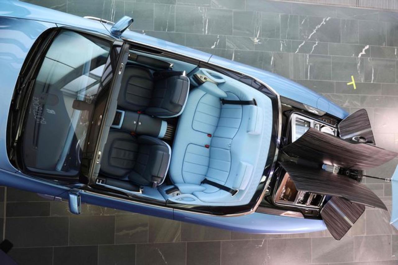 ภายในถูกตกแต่งด้วยหนัง เข้ากับโทนสีของฝากระโปรงหน้า เบาะที่นั่งด้านหน้าหุ้มด้วยหนังสีน้ำเงินเข้มตามการเลือกเฉดสีหนังแท้ของลูกค้า เบาะที่นั่งด้านหลังโทนสีฟ้าอ่อน สีมันวาวคล้ายโลหะถูกใช้คู่กับหนังเพื่อเพิ่มความโดดเด่น ตกแต่งด้วยลายเส้นและเส้นกลมตัดขอบสีฟ้าที่มีความเข้มมากยิ่งขึ้น โดยได้รับแรงบันดาลใจจากเข็มนาฬิกา สีน้ำเงินสดผสมลงในวัสดุ เส้นใยเทคนิคทำมุม 55 องศา สำหรับบริเวณด้านล่างของตัวรถเพื่อเป็นการเลียนแบบคลื่นบนผิวน้ำ