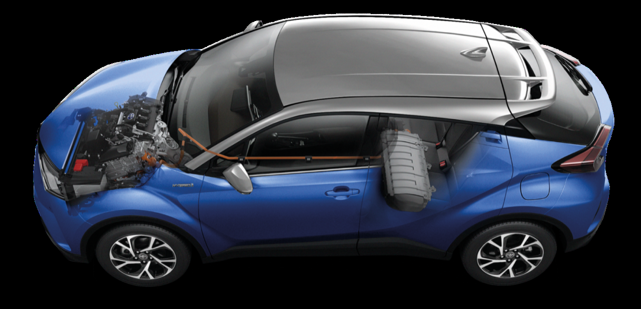 ระบบไฮบริดเจเนอเรชันที่สี่ 4th Generation Hybrid มอเตอร์ไฟฟ้าสองตัว ตัวแรกช่วยเสริมแรงบิด ตัวที่สองเป็นเจนเนเรเตอร์ช่วยปั่นกระแสไฟฟ้าเข้าไปเก็บในแบตเตอรี่ เครื่องยนต์ 2ZR-FXE เบนซิน 4 สูบเรียง วางตามขวาง ขับเคลื่อนล้อหน้า ปริมาตรความจุ 1.8 ลิตร พร้อมระบบ VVT-i ระบบส่งกำลังใช้เกียร์สายพาน เป็นเกียร์ E-CVT ทำอัตราการประหยัดน้ำมัน 20-23 กิโลเมตรต่อลิตร ขับเร็วๆ ยังประหยัดในระดับ 14-16 กิโลเมตรต่อลิตร ระบบไฮบริดเจน 4 ของ Toyota ออกแบบให้ inverter with converter assembly มีขนาดเล็กและมีน้ำหนักเบา สามารถบูสไฟฟ้าแรงสูงอย่างรวดเร็วโดยติดตั้งอยู่ด้านบนของชุดเกียร์ ส่วนแบตเตอรี่ไฮบริดเป็นแบบ ni-mh battery DC 201.6 V168 Cell 6 cell x 28 modules แบตเตอรี่ติดตั้งอยู่ใต้เบาะหลังพร้อมชุดกรองฝุ่นและพัดลมไฟฟ้าระบายความร้อน โดยมี auxiliary battery ติดตั้งอยู่ในห้องเครื่องยนต์ เป็นแบบ EN Type LN1 auxiliary battery ชุดมอเตอร์ 2 ตัวที่ฝังอยู่ในเกียร์เป็นแบบ P610 hybrid transaxle MG1 / MG2 ขนาด 600 โวลต์ ระบายความร้อนด้วยน้ำ มอเตอร์ไฟฟ้า MG 1 ของ C-HR มีแรงดันไฟฟ้าสูงสุด AC600 V กำลังสูงสุด 53 กิโลวัตต์ ส่วนมอเตอร์ไฟฟ้า MG 2 มีแรงบิดสูงสุด 163 นิวตัน-เมตร มีแรงดันไฟสูงสุด AC600 V ระบบ Hybrid จากแบรนด์ Toyota จัดมอเตอร์ไฟฟ้าขนาดเล็ก กำลัง 72 แรงม้า แรงบิดจากมอเตอร์ทำได้ที่ 163 นิวตันเมตร แบตเตอรี่ Hybrid แบบ Ni-MH ควบรวมพลังงานทั้งเครื่องยนต์และมอเตอร์ทำให้ C-HR มีกำลังสูงสุด 122 แรงม้า ระบบส่งกำลังใช้เกียร์อัตโนมัติ แบบ E-CVT มีมอเตอร์ MG-1 และ MG-2 ฝังไว้ในเกียร์เพื่อเสริมแรงบิดและชาร์จไฟใส่แบตเตอรี่ สมรรถนะเร่งจาก 0-100 กิโลเมตรต่อชั่วโมง ใน 11.3 วินาที