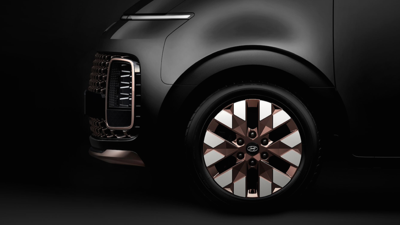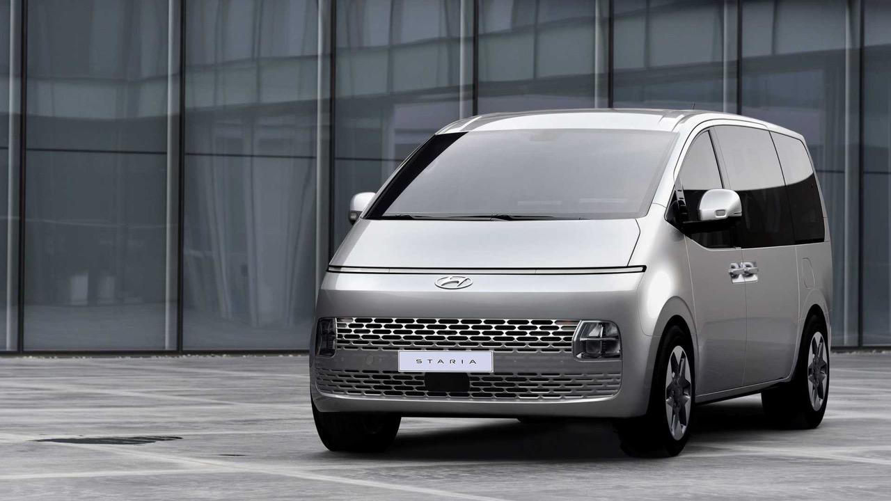 รูปลักษณ์ด้านหน้า Staria ติดตั้งไฟส่องสว่างกลางวัน LED Daytime Running Light แนวนอนขวางบริเวณสองข้างของกระโปรงหน้า เพื่อเข้ากับกระจังหน้าที่กว้างลายตาข่าย เน้นความสวยงามด้วยไฟคู่หน้าทรงลูกบาศก์ สีภายนอกด้านหน้าเป็นสีเดียวกันทั้งหมด การเชื่อมโยงรูปลักษณ์ทั้งคันให้มีความกลมกลืน กระจกบานใหญ่รอบคันเพื่อความโปร่ง ถ่ายทอดไปถึงด้านหลังกับกระจกฝาท้ายขนาดใหญ่ บั้นท้ายมีบานกระจกฝาท้ายที่กว้างกว่าเดิม ตัดขอบด้วยไฟท้ายแนวตั้ง ติดตั้งไฟแบบ Parametric Pixel กันชนท้ายตั้งอยู่ในระดับต่ำ ช่วยให้ขนสัมภาระเข้า-ออก ได้ง่ายมากขึ้น