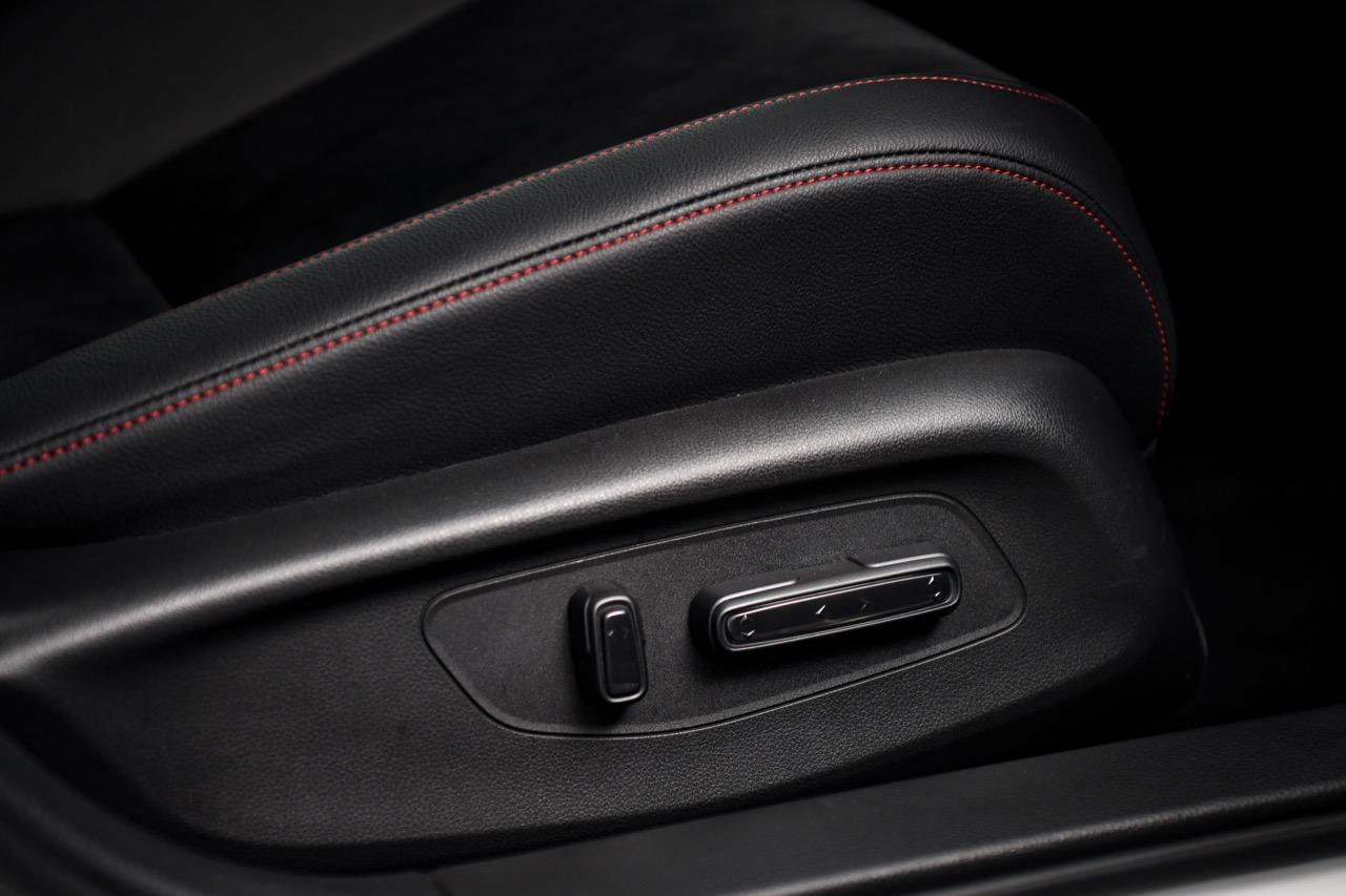 เบาะนั่งหุ้มหนังกลับสลับหนังสังเคราะห์ ตกแต่งด้วยด้ายสีแดง