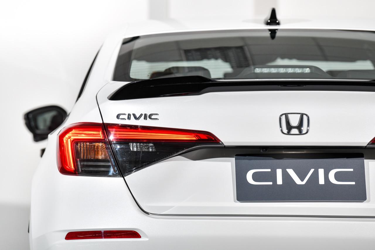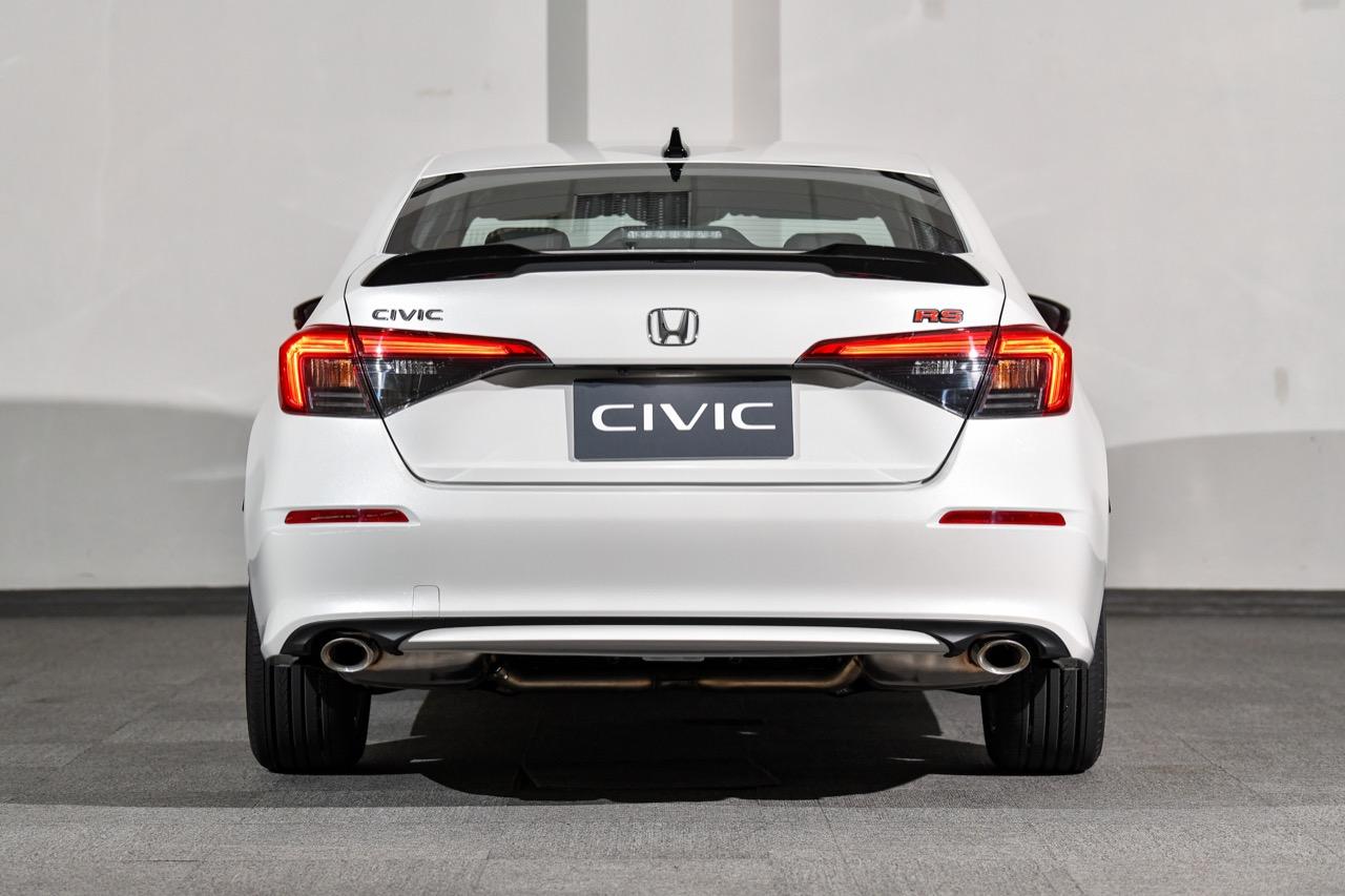 บั้นท้ายที่แตกต่างไปจาก Civic โฉมที่แล้วอย่างสิ้นเชิง ความเห็นส่วนตัวอยากได้ไฟท้ายแบบยาวรี คาดเชื่อมต่อกัน มากกว่าไฟท้ายขนาดใหญ่ใน New Civic ซึ่งทำให้บั้นท้ายของมันยิ่งดูใหญ่โตเกินจริง ไฟท้ายมีทั้งหลอด LED และหลอดไฟแบบปกติผสมกันอยู่ภายในกรอบไฟท้าย ไฟเลี้ยวที่ใช้หลอดไฟแบบปกติ ส่วนไฟเบรกและไฟหรี่ใช้หลอดแบบ LED ขอบด้านบนของฝาท้ายมีครีบรีดอากาศสีดำ ที่มุมของกันชนทั้งสองข้างติดตั้งแผ่นพลาสติกสะท้อนแสงมัลติรีเฟลกเตอร์ ท่อระบายไอเสียทรงรีฝั่งละท่อ ฝาท้ายของ New Civic รุ่นสูงสุดไม่มีระบบไฟฟ้าและใช้การเปิดปิดด้วยการกดปุ่มตรงกึ่งกลางใต้สัญลักษณ์รูปตัว H มิติตัวถังของ Honda New Civic มีขนาดความยาว 4,678 มิลลิเมตร กว้าง 1,802 มิลลิเมตร สูง 1,415 มิลลิเมตร ความยาวฐานล้อ 2,733 มิลลิเมตร ระยะห่างล้อหน้า 1,547 มิลลิเมตร ระยะห่างล้อหลัง 1,587 ความสูงจากพื้นถึงใต้ท้องรถ 126 มิลลิเมตร น้ำหนักรถรุ่น RS 1,336 กิโลกรัม ความจุถังเชื้อเพลิง 47 ลิตร ขนาดยางอะไหล่ T125 /80D16