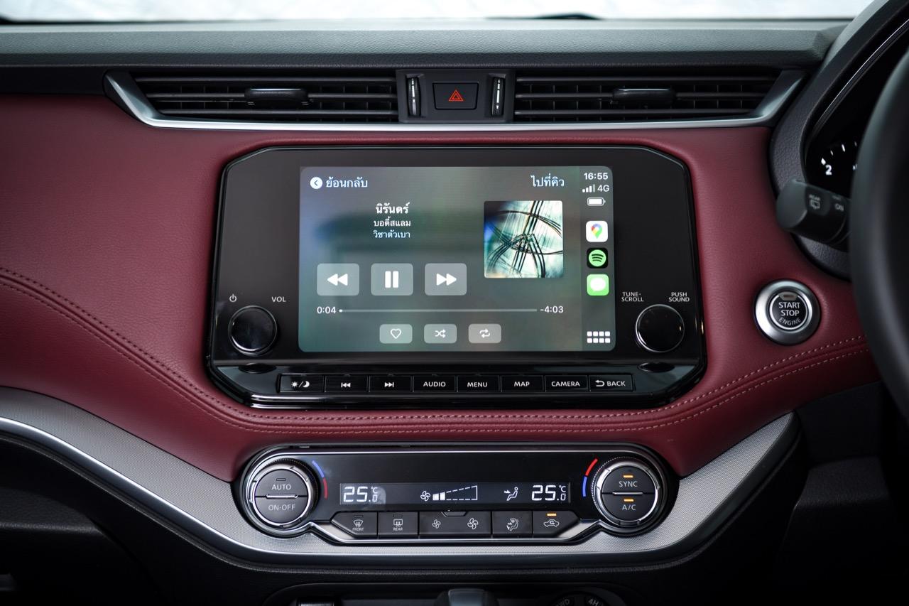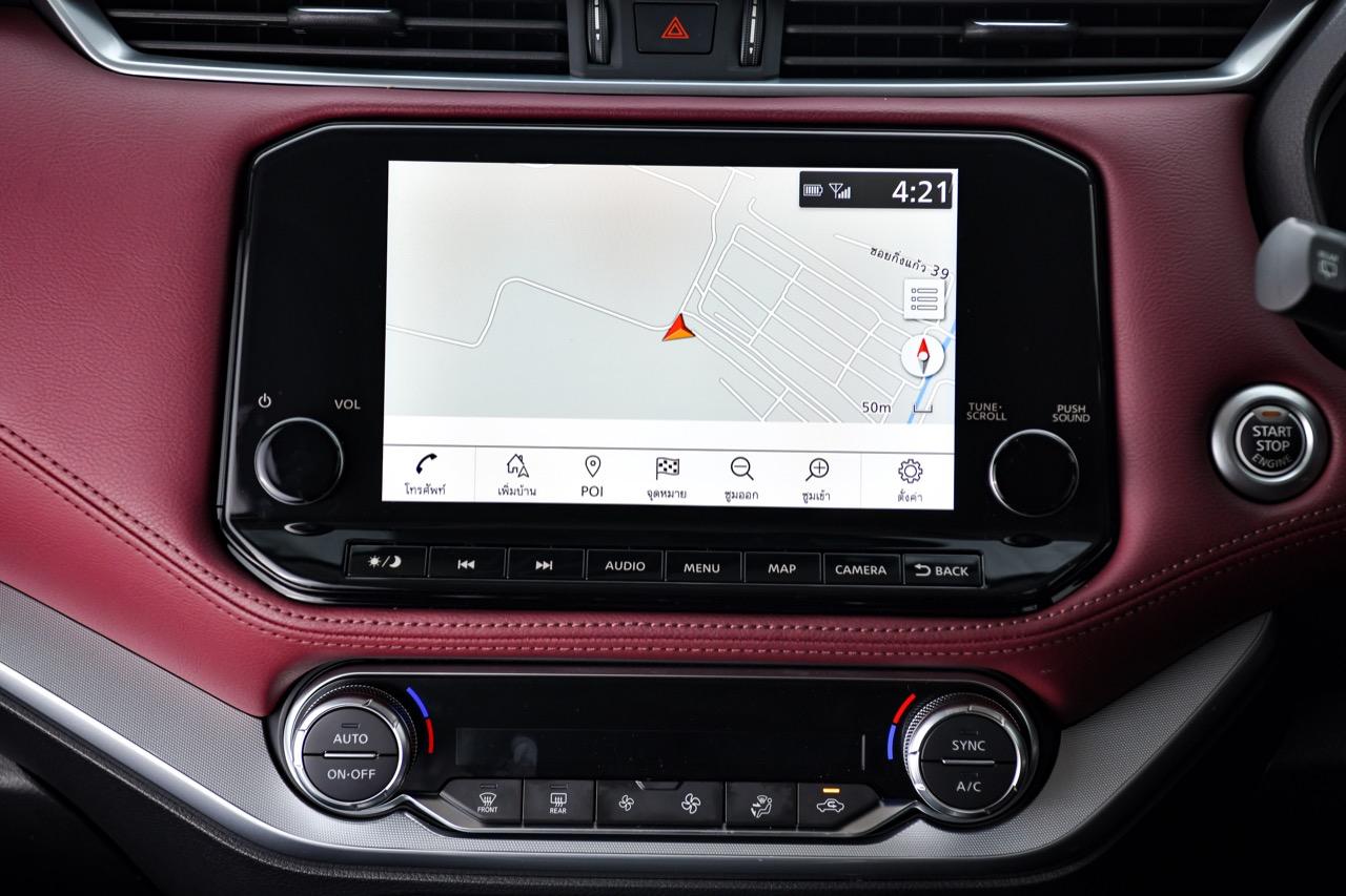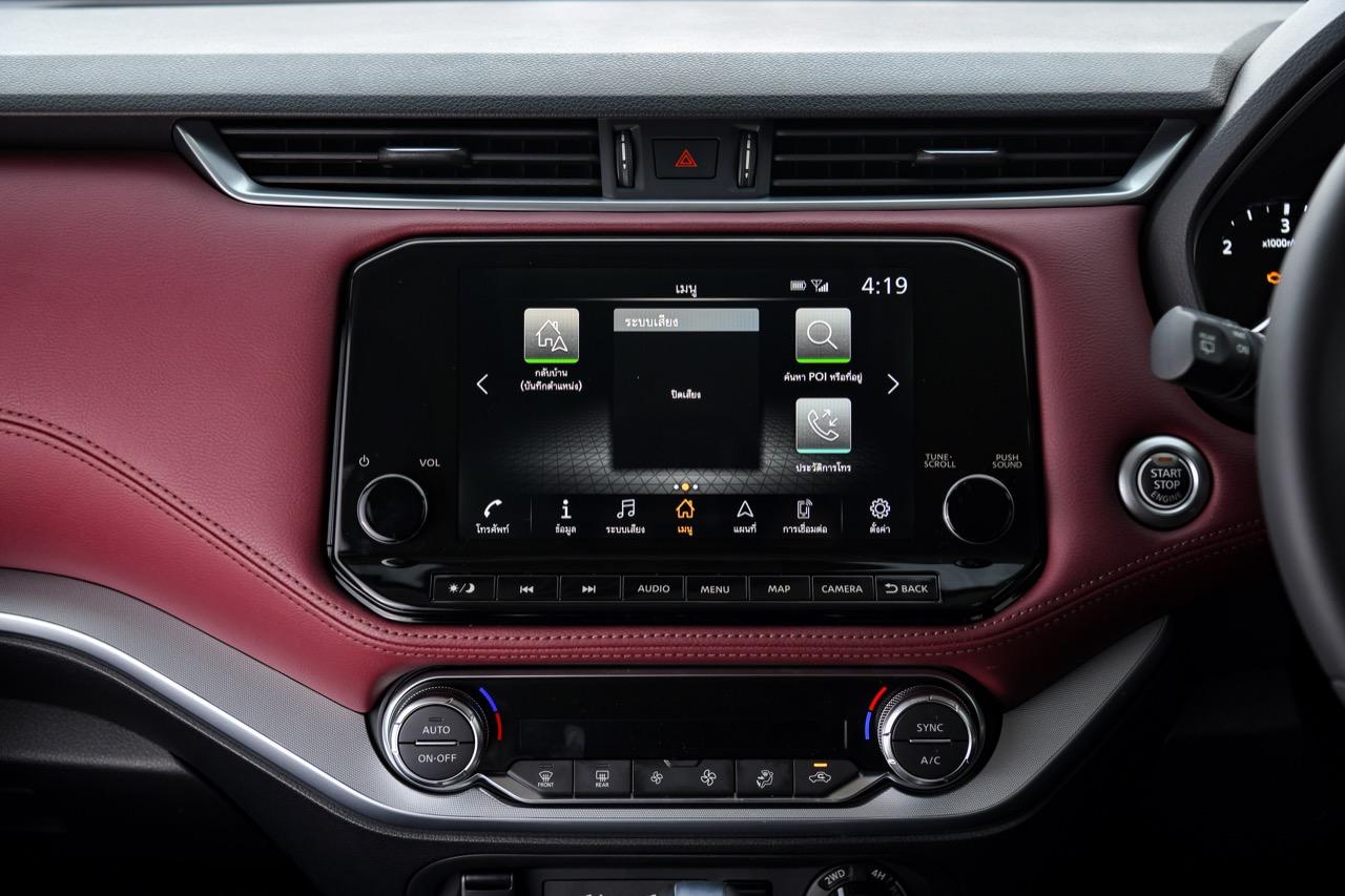 หน้าจอสัมผัส Display Audio ใหม่ ขนาด 9 นิ้ว พร้อม Nissan Connect รองรับการเชื่อมต่อสมาร์ทโฟนผ่าน Apple CarPlay แบบไร้สาย รองรับการเชื่อมต่อผ่าน Android Auto ระบบนำทาง (Navigation System) และทุกแอปพลิเคชันความบันเทิง หน้าจอสัมผัสขนาด 9 นิ้ว WXGA (1024x768) ความละเอียดสูง ระบบสั่งงานด้วยเสียง (Voice Recognition) ซึ่งได้จัดวางในตำแหน่งที่สะดวกต่อการใช้งานและลดแสงสะท้อน