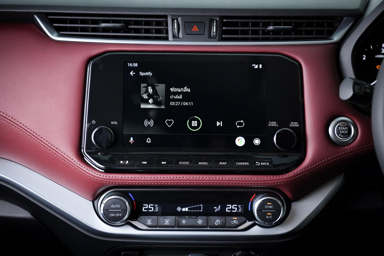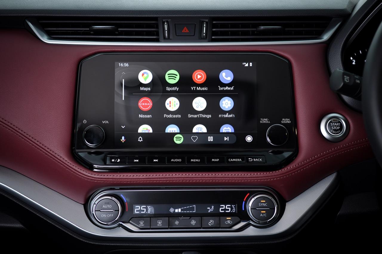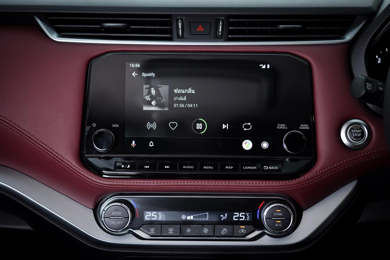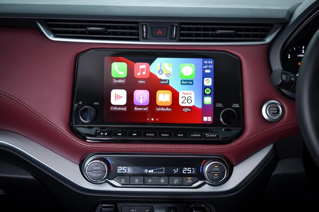 หน้าจอสัมผัส Display Audio ใหม่ ขนาด 9 นิ้ว พร้อม Nissan Connect รองรับการเชื่อมต่อสมาร์ทโฟนผ่าน Apple CarPlay แบบไร้สาย รองรับการเชื่อมต่อผ่าน Android Auto ระบบนำทาง (Navigation System) และทุกแอปพลิเคชันความบันเทิง หน้าจอสัมผัสขนาด 9 นิ้ว WXGA (1024x768) ความละเอียดสูง ระบบสั่งงานด้วยเสียง (Voice Recognition) ซึ่งได้จัดวางในตำแหน่งที่สะดวกต่อการใช้งานและลดแสงสะท้อน