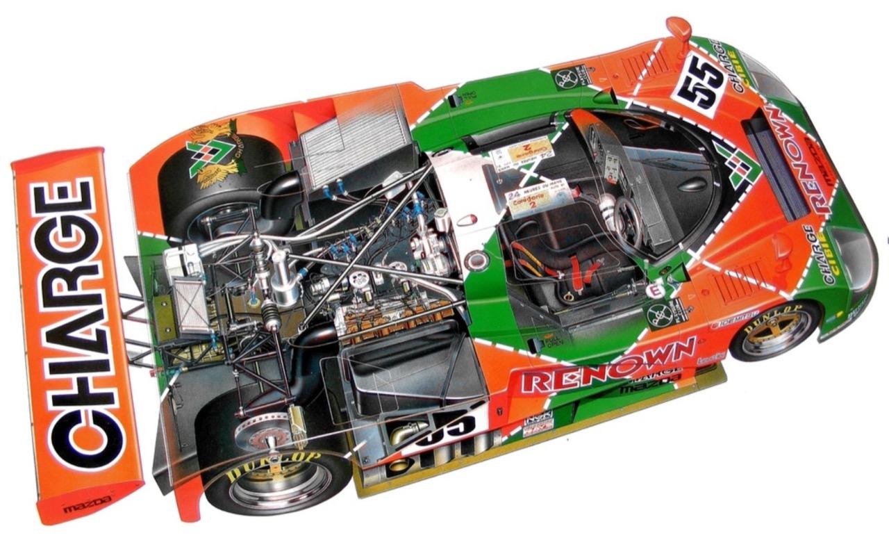 Mazda เชื่อมั่นในหลักการของเครื่องยนต์สูบหมุนโรตารี โดยปรับแต่งพละกำลังของเครื่องยนต์สูบหมุนในรถแข่ง Group C มาตั้งแต่ปี 1983 รวมถึงการแข่งรถในอดีต นับตั้งแต่ Mazda Cosmo ได้อันดับที่สี่ (ตามหลัง Porsche 911 สองคันและ Fulvia HF) ในการวิ่งสุดทรหดยาวนานถึง 84 ชั่วโมง บนสนามนรกเขียว Nurburgring ในปี 1968 ใช่ครับ เป็นการแข่งเอนดูแรนซ์ระยะทางไกลโคตรนานถึง 84 ชั่วโมงไม่ใช่ 24 ชั่วโมงที่แข่งกันอยู่ในปัจจุบัน ดังนั้นหลังจาก 23 ปีของการแข่งรถด้วยเครื่องโรตารี นี่คือชอตสุดท้ายของเครื่องยนต์ปฏิวัติวงการ บนเวทีการแข่งรถระดับโลก ทศวรรษแห่งการขัดเกลาเครื่องยนต์สูบหมุนของ Mazda จนได้เครื่องยนต์โรตารีที่ดีที่สุดในโลก