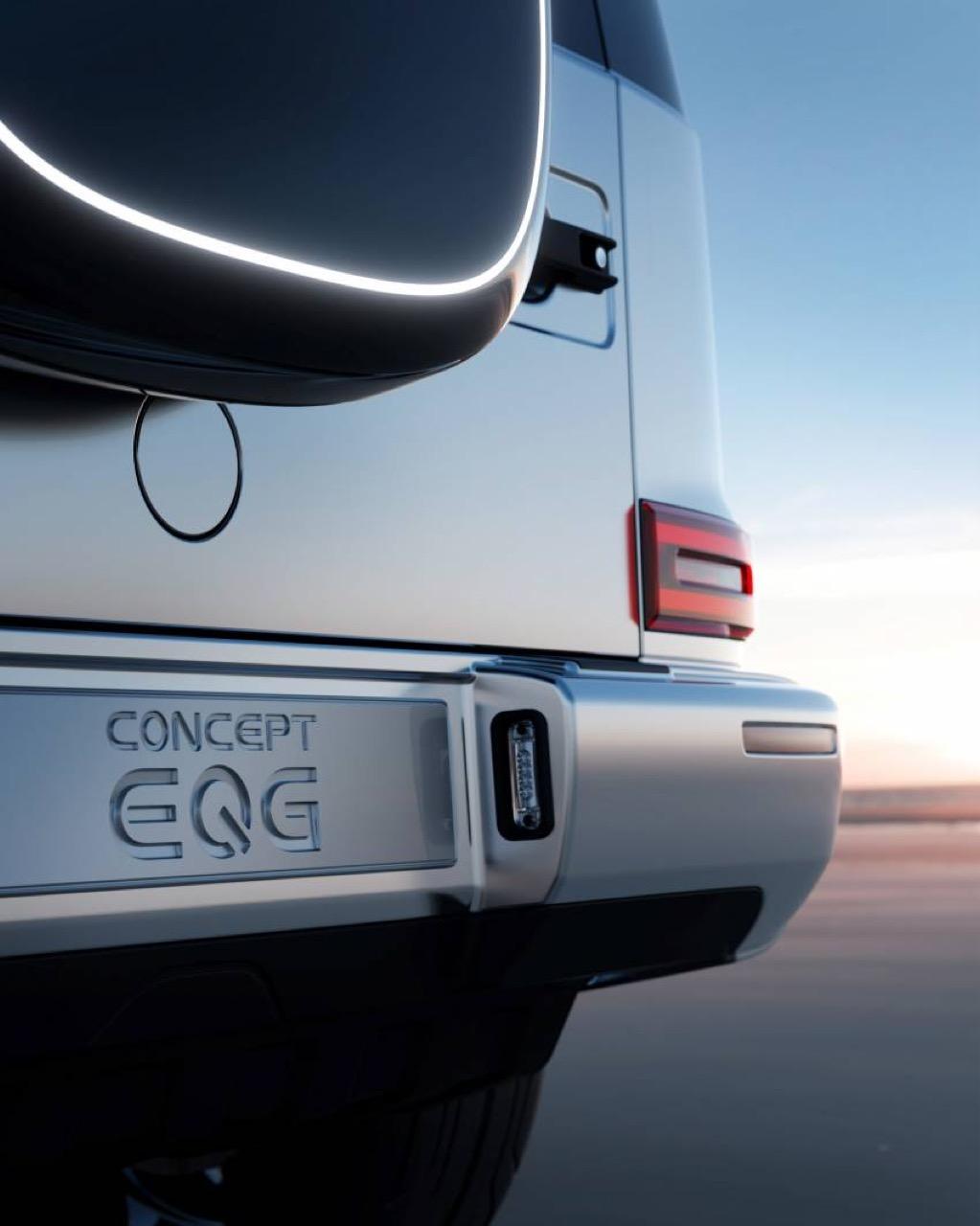 เห็นได้ชัดว่า EQG เป็น G-Class ที่แตกต่างจากรุ่นเครื่องยนต์สันดาปภายใน หากไม่มีเครื่องยนต์ใต้ฝากระโปรง กระจังหน้า G-Class อันโดดเด่น จะกลายเป็นกระจังหน้าสีดำแบบเรืองแสง ใน Concept EQG กระจังสี่เหลี่ยมสีน้ำเงินสว่างไสวด้วยไฟ LED สร้างลักษณะกระจังหน้าเทียม โดยมีดาวสามแฉกตรงกลางสว่างเป็นเอฟเฟกต์แบบ 3 มิติ กรอบสีขาวทำให้กระจังหน้าสมบูรณ์ พร้อมไฟ LED ในเวลากลางวันที่โคจรรอบไฟหน้าอย่างโจ่งแจ้ง คุณจะพบไฟ LED ที่ด้านข้างเพิ่มมากขึ้น ซึ่งรวมอยู่ในแถบกันกระแทกของ Concept EQG หลังคาเรียบ มีแถบไฟ LED ที่ด้านหน้าและไฟเบรกดวงที่สามที่ด้านหลัง ล้อขนาด 22 นิ้ว ให้บรรยากาศช่วงปลายทศวรรษ 1990 เจ้า Concept EQG ยังมีที่เก็บยางอะไหล่ทรงกลมเหมือนเดิม เพื่อรองรับยางอะไหล่ซึ่งติดตั้งเอาไว้ที่ด้านหลัง คุณอาจสังเกตเห็นว่าไม่มีรูปทรงเหมือนยาง ในความเป็นจริง มันเป็นเพียงกล่องเก็บของพวกสายชาร์จ กรอบทรงกลมที่อยู่ด้านหลัง ยังคงมีรูปแบบที่แสดงความเคารพต่อ G-Class รุ่นดั้งเดิม แต่เปลี่ยนจากยางอะไหล่ เป็นอุปกรณ์ในการชาร์จไฟ เช่น สายชาร์จ