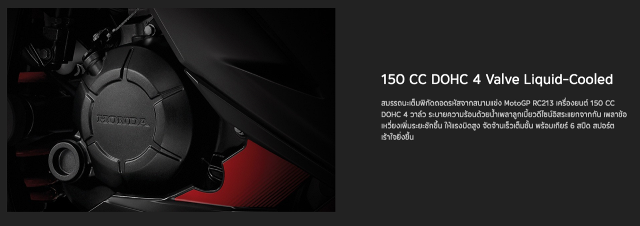 รถสปอร์ตฮอนด้าในตระกูล CBR Series ได้รับการยกให้เป็นซุปเปอร์ไบค์ในดวงใจของนักบิดสายพันธุ์สปอร์ตมาอย่างยาวนาน เอกลักษณ์ความโดดเด่นทั้งในเรื่องของดีไซน์ เทคโนโลยีที่ได้รับการถ่ายทอดจากรถแข่งโมโตจีพีของทีม Honda ที่สร้างเกียรติประวัติคว้าแชมป์ในรายการมอเตอร์สปอร์ตระดับโลกมาแล้วมากมาย New CBR150R มาพร้อมกับเทคโนโลยีที่ถือว่าเหนือชั้นที่สุดในคลาสรถสปอร์ต 150 ซีซี ทั้งการออกแบบตัวรถและอุปกรณ์มาตรฐานที่ได้รับการถ่ายทอดมาจากรถซุปเปอร์สปอร์ตระดับท็อป เป็นจิ๊กซอว์สำคัญให้กับกลุ่มลูกค้าที่ต้องการเปิดประสบการณ์การขับขี่และสัมผัสความแรงสไตล์เรซซิ่งสปอร์ต ก่อนต่อยอดสู่สปอร์ตไบค์ในตระกูล CBR Series ในพิกัดที่สูงขึ้นต่อไป