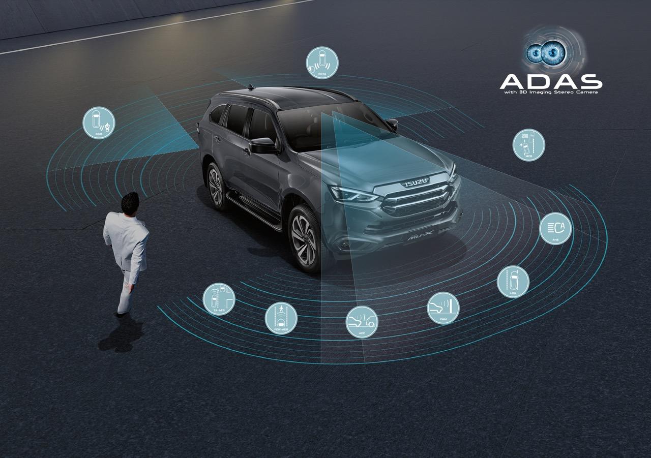 Isuzu MU-X รถอเนกประสงค์ PPV SUV มีการเพิ่ม Turn Assist with AEB ระบบช่วยเบรกฉุกเฉินอัตโนมัติเมื่อมีรถสวนทางขณะเลี้ยวขวา ในระบบช่วยเหลือผู้ขับขี่ ADAS (Advanced Driver Assistance Systems) เทคโนโลยีเพื่อความปลอดภัย Isuzu ทุกรุ่น เพิ่มฟังก์ชันเตือนการรับบริการเพื่อความสะดวกในการบำรุงรักษา