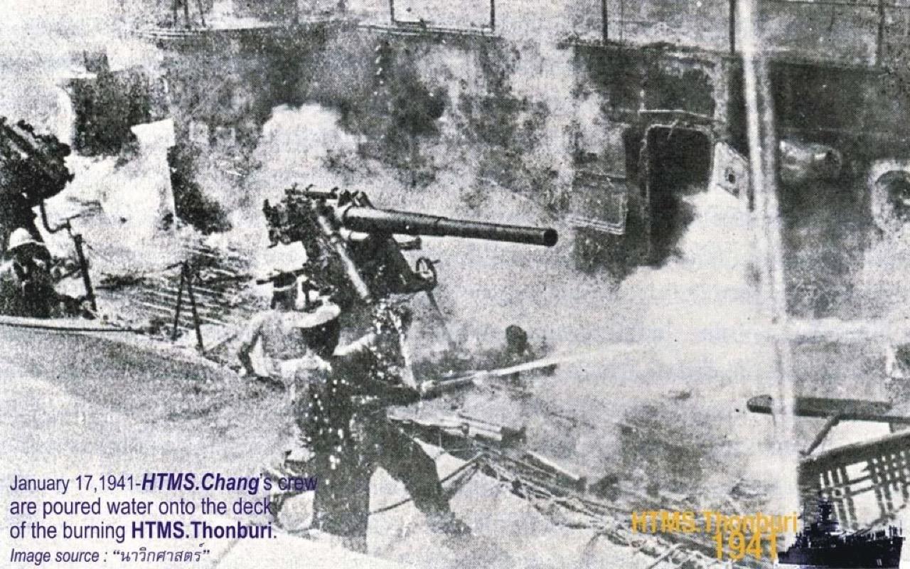 ราชนาวีไทยที่ประจำการอยู่ในเรือ ทั้งๆ ที่บางนายได้รับบาดเจ็บอย่างหนัก แต่ก็ช่วยกันดับไฟที่ไหม้ในจุดต่างๆ อย่างเต็มความสามารถ หม้อฉีดน้ำยาดับไฟ มีอยู่ที่ใด ถูกนำมาใช้จนหมด เมื่อน้ำยาถูกไฟก็ดับ แต่พอน้ำยาดับเพลิงหมด ไฟก็ลุกขึ้นอีก ท่อน้ำดับเพลิงถูกยิงขาด ใช้สายสูบสำหรับต่อฉีดไม่ได้ผล ไฟเริ่มไหม้แรงขึ้นแล้วลามไปที่สะพานเดินเรือ หรือหอบังคับการ ควันไฟไหลไปตามท่อพูด ขึ้นไปรนหอควบคุมการยิง การติดต่อระหว่างหอควบคุมการยิง กับป้อมปืน และหอบังคับการ ใช้งานไม่ได้โดยสิ้นเชิง เนื่องจากผู้บังคับการเรือเสียชีวิต และคนประจำในห้องหอบังคับการได้รับบาดเจ็บสาหัสทั้งหมด ท่อพูดและสายไฟที่ใช้ในการยิงขาดออกจากกันจากแรงระเบิด ต้นปืน (ร.อ.เปลี่ยน นิ่มเนื้อ) จึงสั่งไปยังป้อมให้ทำการยิงอิสระทันที และให้พวกที่ประจำหอควบคุมการยิงลงไปข้างล่าง เพราะสุดความสามารถที่หอควบคุมการยิง จะปฏิบัติงานได้ผลอีกต่อไป ทหารเรือที่ประจำหอควบคุมการยิง ต่างก็ไต่และโหนตัวฝ่าเปลวไฟลงมาข้างล่าง และวิ่งไปประจำเครื่องถือท้ายอะไหล่ท้ายเรือ ต้นปืนพร้อมด้วยผู้ช่วยต้นปืน และต้นหนได้ช่วยกันดำเนินการบังคับนำเรือ ด้วยเครื่องจักร อยู่บนสะพานควบคุมปืนเบาเสาท้าย ในห้วงเวลานั้นราชนาวีไทยต้องเสียเวลาในการเปลี่ยนไปใช้เครื่องหางเสืออะไหล่ท้ายเรือนานหลายนาที ทำให้เรือรบข้าศึกเพิ่มความได้เปรียบมากขึ้นไปอีก