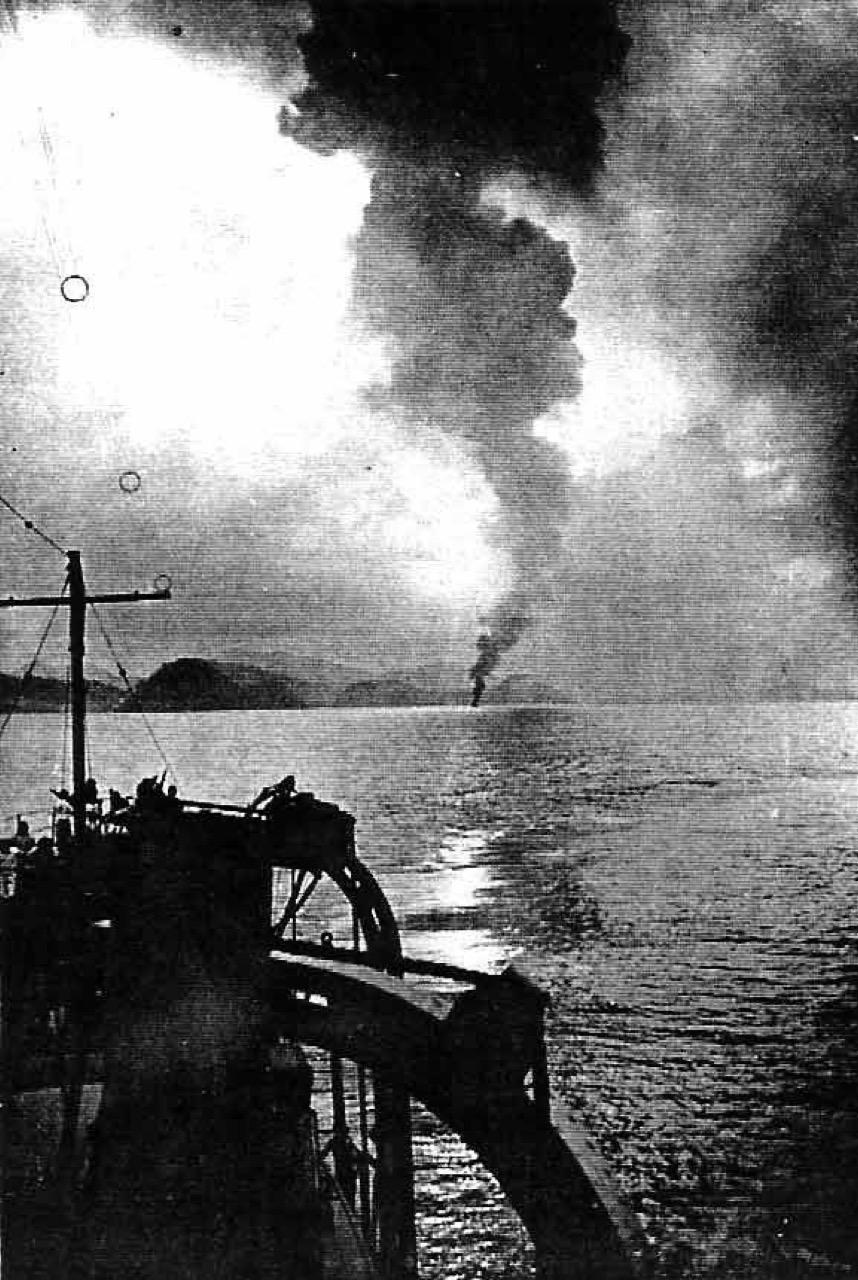 "ลักษณะของเรือข้าศึก ลำที่ข้าพเจ้าเห็นครั้งแรก (หมายความถึงเรือ ลามอตต์ปิเกต์) และกำลังแล่นกลับมา ครั้งหลังนี้ เท่าที่ข้าพเจ้าเห็น สะพานเดินเรือได้รับความเสียหาย พรวนชักธงไม่มี เสาธงหักขาด ที่เหลืออยู่ สูงกว่าปล่องไฟเล็กน้อย มีไฟไหม้ทางหัวเรือ และมองเห็นแสงไฟบริเวณท้ายเรือที่เริ่มปริ่มน้ำ"