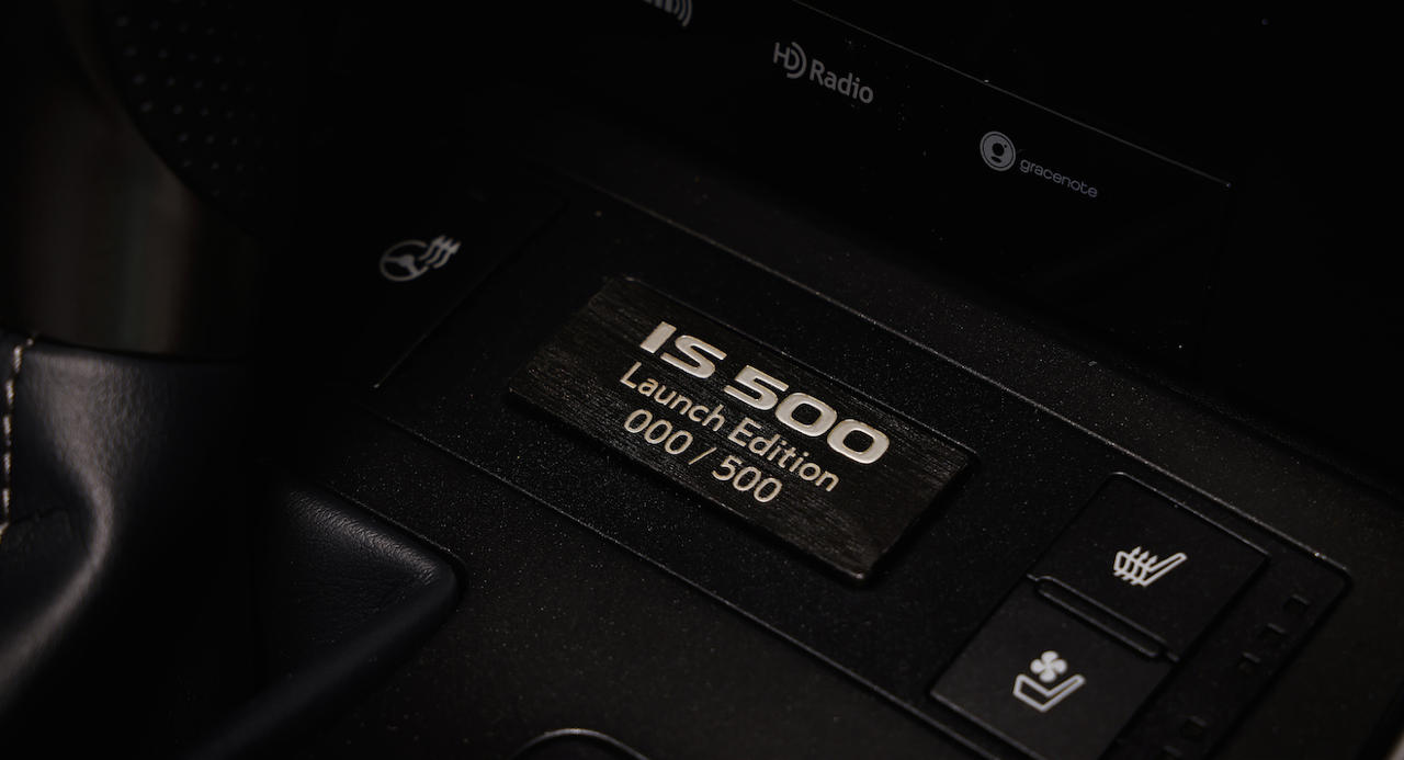 Lexus IS500 F Sport Performance Launch Edition เครื่องยนต์ 5.0L V8 ให้กำลัง 472 แรงม้า แรงบิด 395 ปอนด์-ฟุต - 535 นิวตันเมตร Exclusive Incognito – ใหม่ทั้งหมดในโทนสีคลาสสิกของ Lexus เบาะนั่งหุ้มด้วยหนังกลับ Ultrasuede® ทูโทน พร้อมคอนโซลกลางหนังกลับ ล้ออัลลอยน้ำหนักเบาพิเศษ BBS® สีดำด้าน 7 ก้าน ขนาด 19 นิ้ว ตราสัญลักษณ์ Launch Edition