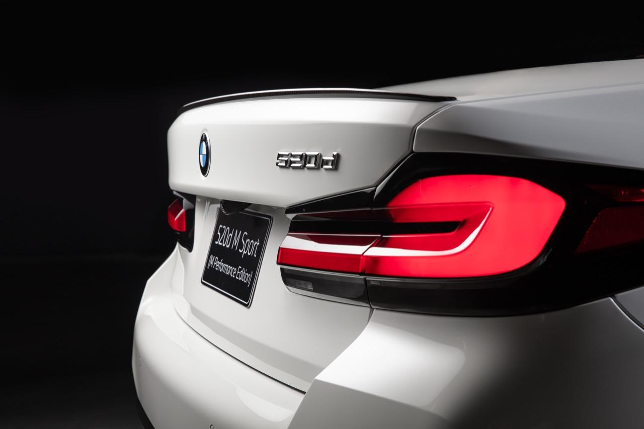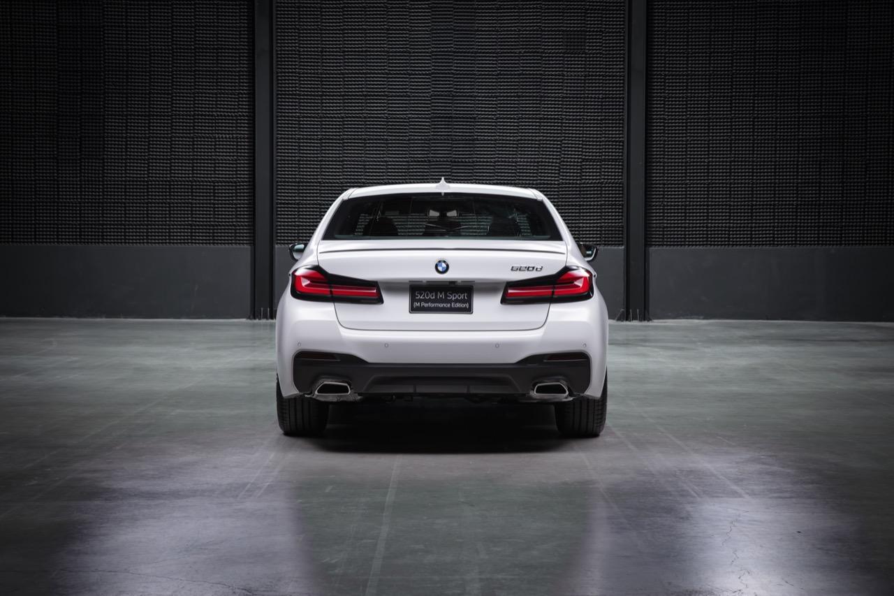 บั้นท้ายของ BMW 520d M Sport (M Performance Edition) สื่อถึงรูปลักษณ์ที่ผสานความสง่างามและล้ำสมัย จากการออกแบบเส้นสายที่คมชัด ไฟท้ายใหม่ LED มาในรูปแบบสามมิติทรงตัว L รับกับไฟหน้า กรอบไฟท้ายสีดำ ทั้งไฟท้ายและไฟเบรกมีดีไซน์ที่กลมกลืนเป็นหนึ่งเดียว 520d M Sport (M Performance Edition) เสริมลุคสปอร์ตด้วยท่อไอเสียทรงสี่เหลี่ยมคางหมูที่ท้ายรถทั้งสองข้าง รวมเป็นส่วนหนึ่งของกันชนท้าย แพ็กเกจ M Performance ของ BMW 520d M Sport (M Performance Edition) มาพร้อมกับอุปกรณ์ตกแต่งแบบเอ็กซ์คลูซีฟ ซึ่งรวมถึงกระจังหน้าทรงไตคู่คาร์บอนไฟเบอร์ M Performance, สปลิทเตอร์หน้าคาร์บอนไฟเบอร์ M Performance, สปอยเลอร์หลังคาร์บอน, ฝาครอบกระจกคาร์บอน, แถบสติกเกอร์ข้างตัวรถ M Performance และสติกเกอร์สัญลักษณ์ M Performance บริเวณสเกิร์ตข้าง