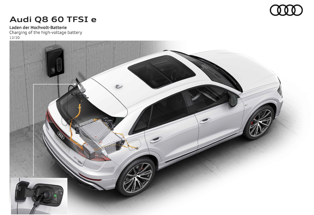 Audi Q8 60TFSI Quattro S Line Plug in Hybrid มาพร้อมกับสายชาร์จสำหรับปลั๊กไฟในครัวเรือนหรือในโรงงานอุตสาหกรรม ความจุในการชาร์จสูงสุด 7.4 กิโลวัตต์ แบตเตอรี่เปล่า สามารถชาร์จจนเต็มได้ภายในเวลาประมาณสองชั่วโมงครึ่ง ในสยุโรป แอป myAudi ลูกค้าสามารถใช้บริการที่ปรับแต่งได้จาก Audi connect บนสมาร์ทโฟน บริการเสริมเหล่านี้ช่วยให้สามารถตรวจสอบสถานะแบตเตอรี่และช่วงระยะเวลาเมื่อเริ่มกระบวนการชาร์จ ตั้งโปรแกรมจับเวลาการชาร์จ และดูสถิติการชาร์จและการสิ้นเปลืองพลังงานไฟฟ้า สถานีชาร์จถูกแสดงอยู่ในทั้งแอปและในระบบนำทาง MMI plus อีกฟังก์ชันหนึ่งของแอป myAudi คือ ระบบควบคุมสภาพอากาศภายในรถก่อนออกเดินทาง ระบบทำความร้อนที่พวงมาลัยและเบาะนั่ง รวมถึงการระบายอากาศของเบาะนั่ง