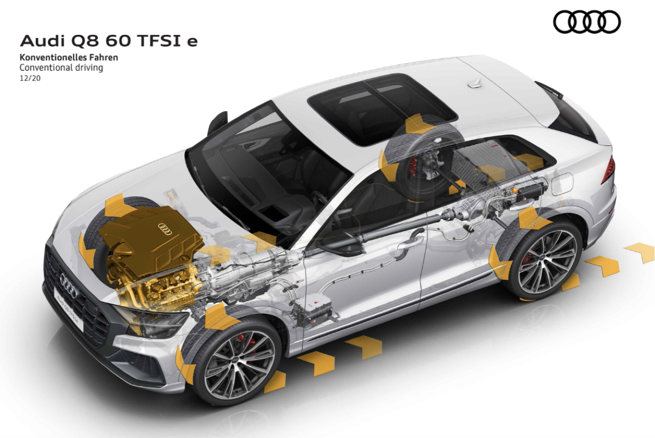 การจัดการแบบผสมผสานและกลยุทธ์การดำเนินงานเชิงคาดการณ์ของซอฟต์แวร์ควบคุมในระบบขับเคลื่อน การจัดสรรพลังงานของ Audi Q8 60TFSI e quattro มีการเลือกกลยุทธ์การดำเนินงานที่เหมาะสม สำหรับการเดินทางแต่ละครั้งโดยอัตโนมัติ SUV Coupé จะสตาร์ตด้วยโหมด “EV” แบบใช้ไฟฟ้าทั้งหมด ที่ความเร็วต่ำขณะขับเคลื่อนด้วยไฟฟ้า (ในเมืองที่มีผู้คนพลุกพล่าน) ลำโพงของระบบ AVAS ที่อยู่บริเวณซุ้มล้อหน้าขวาจะส่งเสียงเตือนตามกฎหมายกำหนด (AVAS ระบบแจ้งเตือนตำแหน่งรถแบบอะคูสติก) เครื่องยนต์เบนซินจะทำงานก็ต่อเมื่อคนขับเหยียบคันเร่งเต็มที่ หรือที่เรียกว่า “แป้นคันเร่งแบบ Active” เมื่อชาร์จไฟจนเต็ม หากต้องการขับเคลื่อนด้วยพลังงานไฟฟ้าให้มากที่สุด สามารถเลือกโหมด “EV” ในจอแสดงผล MMI ส่วนกลาง โหมด Hybrid ซึ่งเป็นกลยุทธ์การบริหารพลังงานของระบบขับเคลื่อนหลักใน Audi Q8 TFSI e quattro ประกอบด้วยโหมดการทำงานสามโหมด คือ Auto / Hold /Charge ในโหมด "อัตโนมัติ" หรือ Auto ระบบไฮบริดจะเลือกการขับเคลื่อนที่เหมาะสมที่สุดแบบอัตโนมัติ มันจะใช้ไฟฟ้าเต็มที่ 100% ในย่านความเร็วต่ำ, ผสมผสานด้วยการขับเคลื่อนของเครื่องยนต์ TFSI ที่ความเร็วสูง เมื่อขับเร็ว ระบบจะใช้พลังงานของทั้งสองแบบผสมกัน ข้อมูลจากสภาพแวดล้อมของการขับถูกประเมินผลอยู่ตลอดเวลาแล้วแจ้งเตือนที่หน้าจอของระบบ MMI แม้ว่าระบบนำทางจะถูกปิดการใช้งาน
