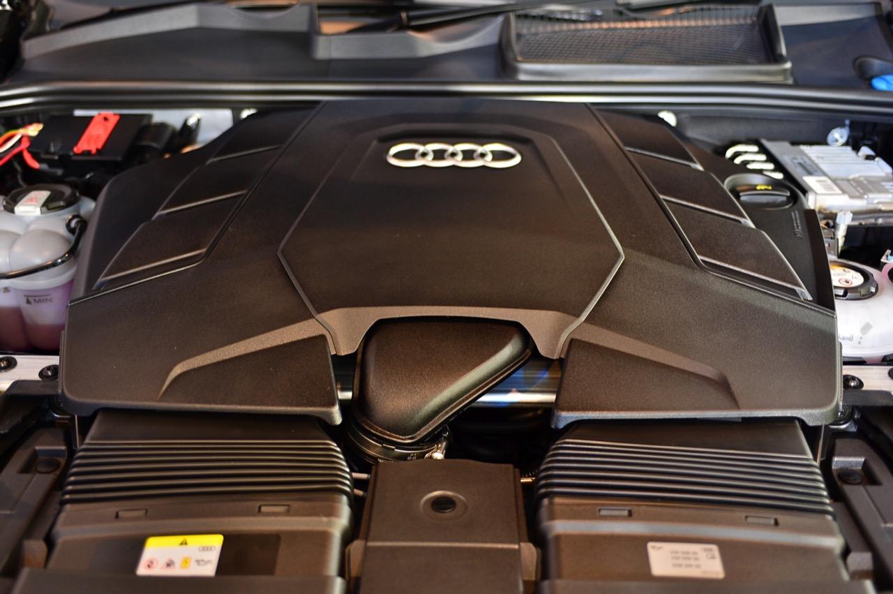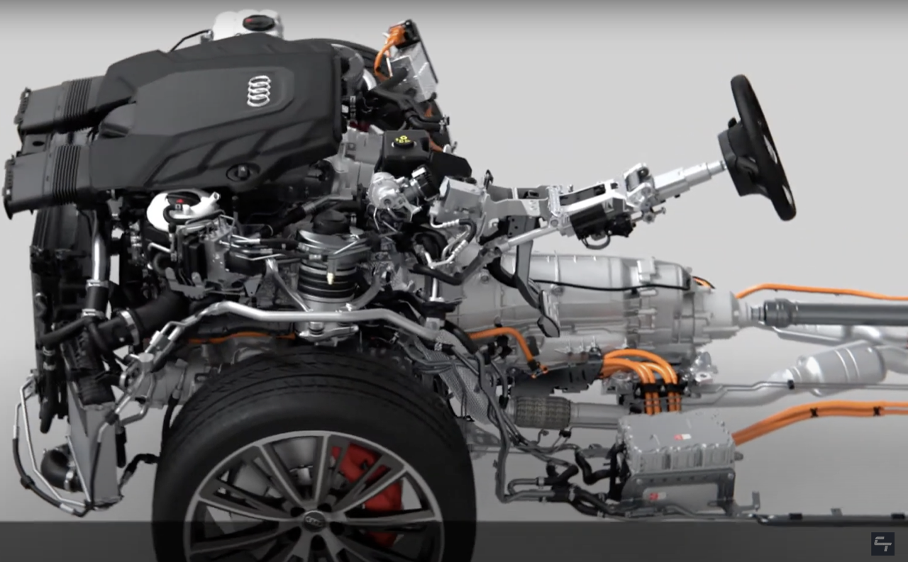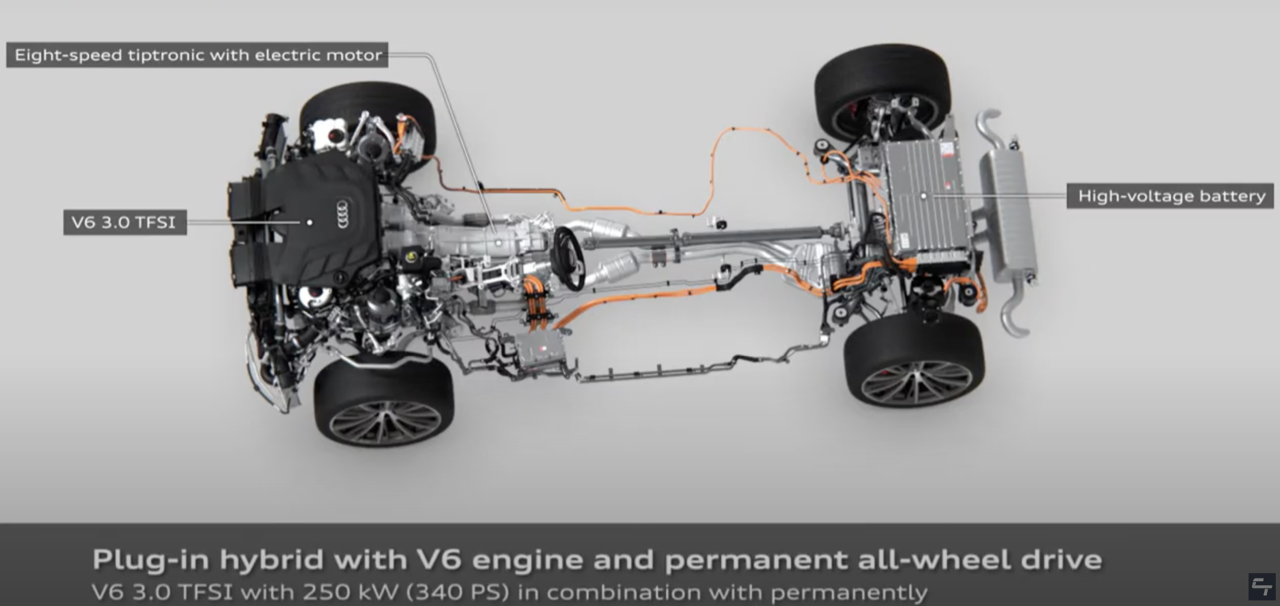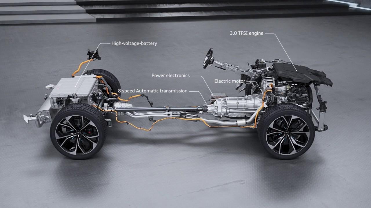 มอเตอร์ไฟฟ้าและเครื่องยนต์เบนซิน V6 3.0 TFSI ส่งกำลังไปยังเกียร์ Triptronic 8 สปีด เป็นชุดส่งกำลังที่ปรับตั้งให้สามารถเปลี่ยนอัตราทดได้อย่างรวดเร็ว ไหลลื่นปราศจากอาการกระตุกกระชาก ปั๊มเชื้อเพลิงแบบไฟฟ้าของระบบ TFSI ช่วยให้จ่ายน้ำมันได้อย่างแม่นยำ แม้เครื่องยนต์เบนซิน V6 จะปิดการทำงาน ระบบขับเคลื่อนทุกล้อแบบถาวรหรือ Quattro มีการควบคุมทางกล ระหว่างการขับขี่ปกติ Quattro จะกระจายแรงบิด 40 เปอร์เซ็นต์ไปยังเพลาหน้า และ 60 เปอร์เซ็นต์ไปทางล้อด้านหลัง เมื่อเซนเซอร์ของชุด Quattro ตรวจพบว่า มีความจำเป็นจะต้องผกผันแรงบิดอย่างต่อเนื่อง ก็สามารถส่งกำลังที่มากขึ้นไปยังเพลาเพื่อเสริมแรงยึดเกาะให้ดีขึ้น ชุดขับเคลื่อนสี่ล้อแบบใหม่ สามารถกระจายแรงบิดไปยังเพลาหน้าได้ถึง 85 เปอร์เซ็นต์ หรือส่งถ่ายไปยังเพลาหลังได้ถึง 70 เปอร์เซ็นต์