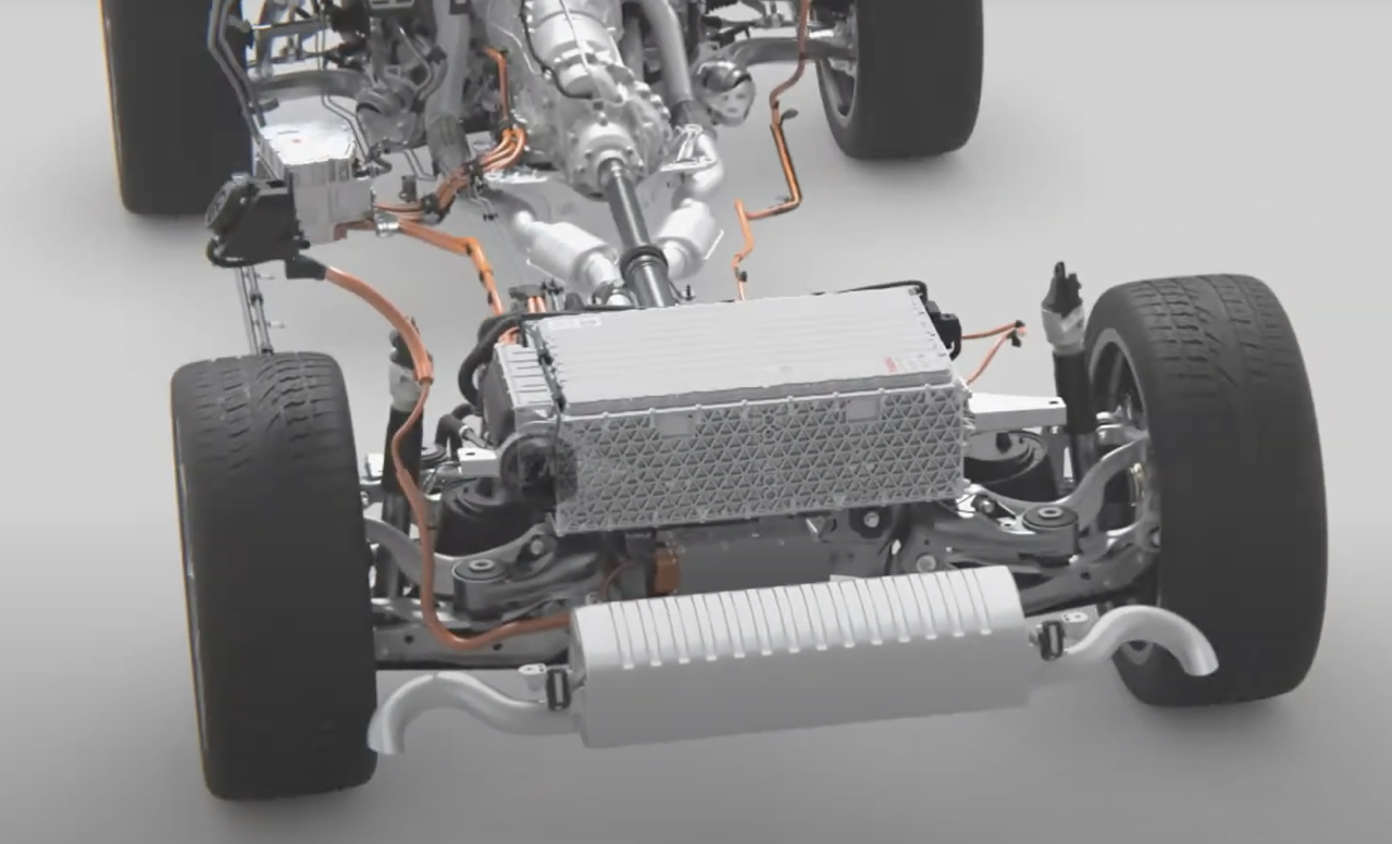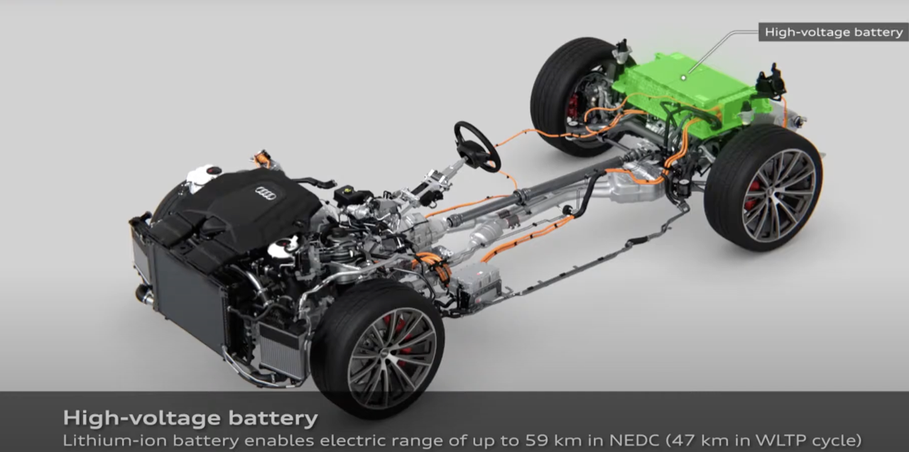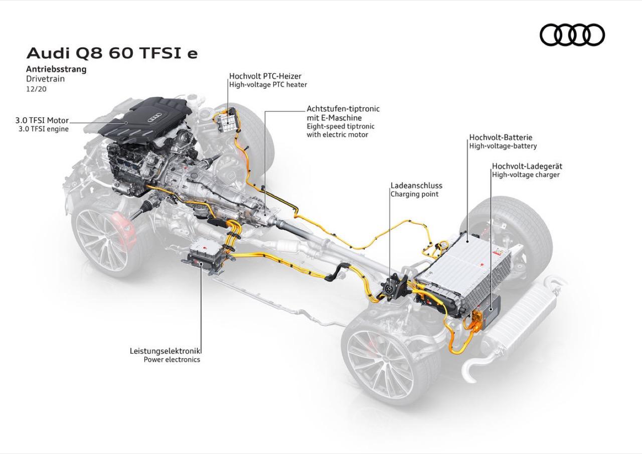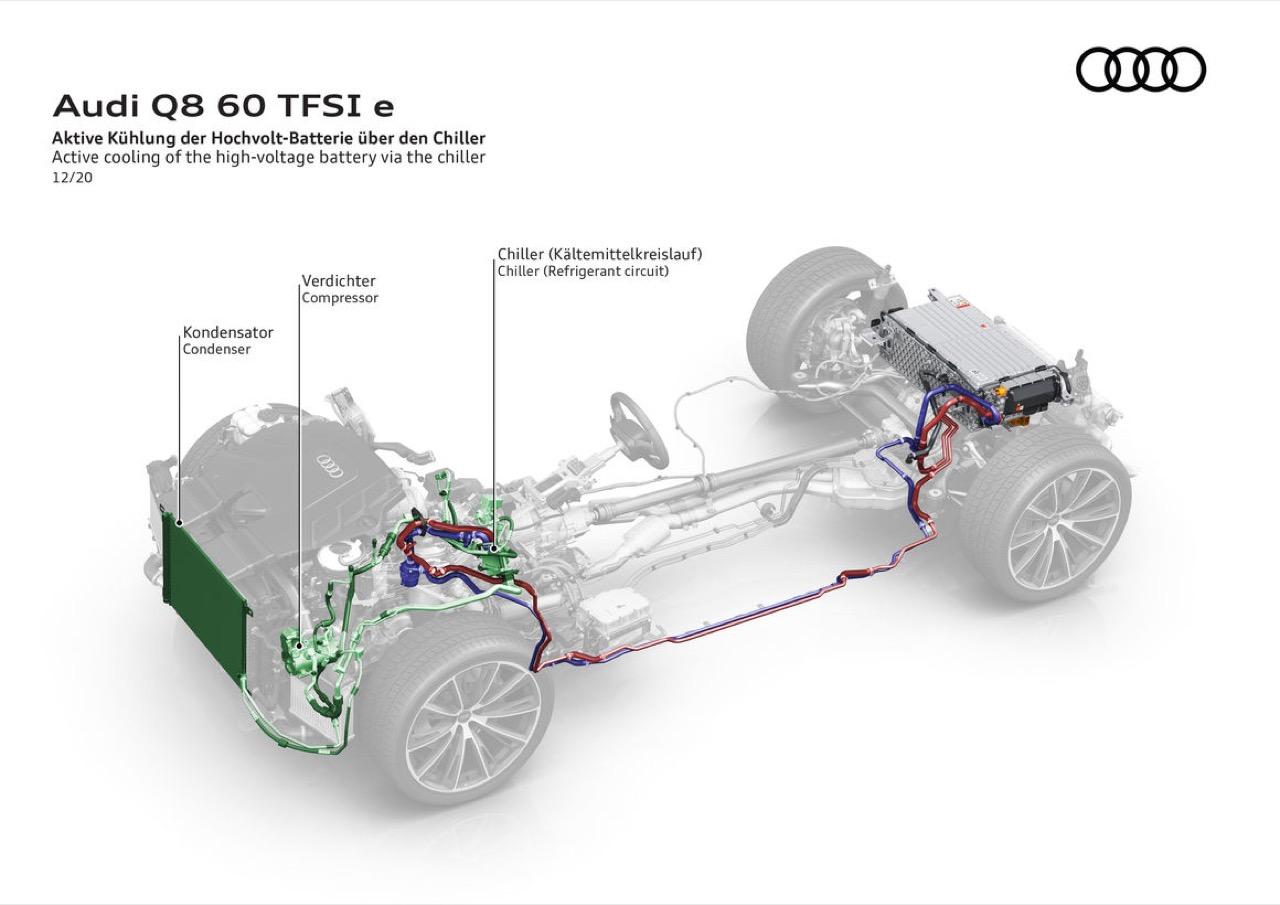 แบตเตอรี่ลิเทียมไอออนติดตั้งอยู่ใต้ห้องเก็บสัมภาระท้าย ประกอบด้วยเซลล์ปริซึมรุ่นล่าสุด 104 เซลล์ ควบรวมเป็น 13 โมดูล เซลล์แบตเตอรี่แต่ละเซลล์ ออกแบบให้มีความยืดหยุ่นในการจ่ายไฟให้กับมอเตอร์ขับเคลื่อน ความจุไฟฟ้า 48 Ah แบตเตอรี่มีความจุพลังงาน 17.9 kWh ซึ่งมากกว่าแบตเตอรี่ที่ประจำการอยู่ใน Q7 TFSI e quattro 0.7 kWh และเปิดตัวในตลาดรถหรูของยุโรปและอเมริกาเมื่อปี 2019 ปัจจุบัน Q7 ได้ติดตั้งแบตเตอรี่รุ่นล่าสุด ซึ่งมีความจุเพิ่มขึ้นและมีขนาดกะทัดรัดกว่าเดิม แบตฯ มีน้ำหนักประมาณ 70 กิโลกรัม การระบายความร้อนด้วยของเหลว ซึ่งสร้างการไหลเวียนเพื่อถ่ายเทความร้อน อุณหภูมิที่เหมาะสมจะเป็นปัจจัยหลักสำหรับประสิทธิภาพการทำงานของแบตฯ ทั้งความจุและการถ่ายเทกระแสไฟ โมดูลถูกเชื่อมต่อกับวงจรน้ำหล่อเย็น เพื่อควบคุมอุณหภูมิของเครื่องยนต์ ระบบไฟฟ้าและอิเล็กทรอนิกส์ มันแปลงกระแสตรงจากแบตเตอรี่เป็นกระแสไฟสามเฟสเพื่อให้พลังงานแก่มอเตอร์ไฟฟ้า เมื่อผู้ขับยกคันเร่งหรือเบรก ระบบ regenerative breaking system จะปั่นไฟเพื่อส่งกลับไปยังแบตเตอรี่เพื่อใช้เป็นพลังงานไฟฟ้าสำรอง