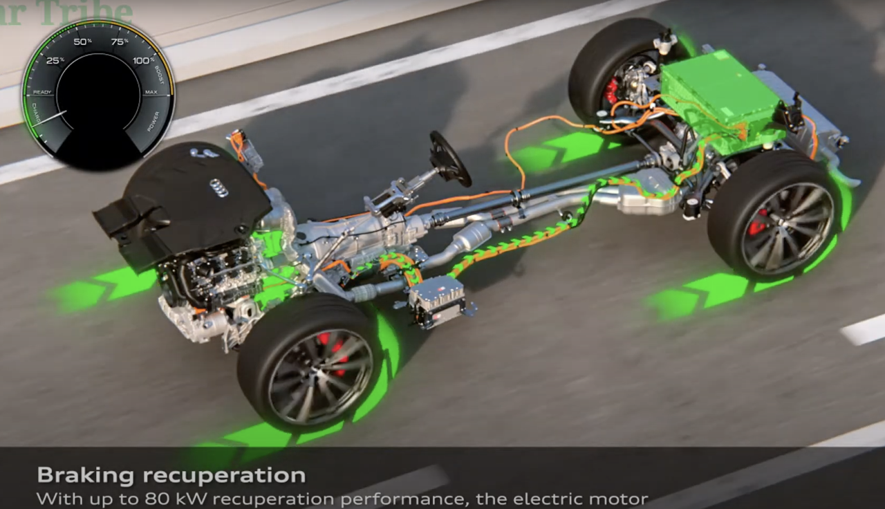 regenerative braking system พลังการฟื้นฟูกระแสไฟฟ้ากลับคืนสู่แบตเตอรี่สูงสุดถึง 80 กิโลวัตต์ ระบบช่วยคาดการณ์นับเป็นซอฟต์แวร์ที่มีประสิทธิภาพ เป็นสมองกลไฟฟ้าที่สำคัญในระบบขับเคลื่อนของ Q8 PHEV เมื่อผู้ขับเหยียบคันเร่ง จะมีการตัดสินใจว่ารถจะเปลี่ยนไปใช้ freewheeling ของเครื่องยนต์ V6 TFSI ที่ปิดการทำงานในฟังก์ชัน coasting หรือจะลดความเร็วด้วยการหน่วงของมอเตอร์ไฟฟ้า และด้วยเหตุนี้ การชาร์จไฟคืนกลับสู่แบตฯ ขณะวิ่งด้วยความเร็ว สามารถดึงพลังงานกลับคืนมาได้ถึง 25 กิโลวัตต์ในโหมดชาร์จ มอเตอร์ไฟฟ้ายังทำหน้าที่หน่วงความเร็วได้เต็มศักยภาพ เบรกไฮดรอลิกของ Q8 PHEV ใช้งานในกรณีที่ต้องการลดความเร็วลงอย่างฉับพลันทันที พร้อมๆ กับการชาร์จไฟของ regenerative braking system แป้นเบรกตอบสนองดีและปรับค่าของแรงเบรกได้อย่างแม่นยำ Audi Q8 TFSI e quattro ให้กำลังการ regen สูงสุด 80 กิโลวัตต์ขณะใช้เบรก