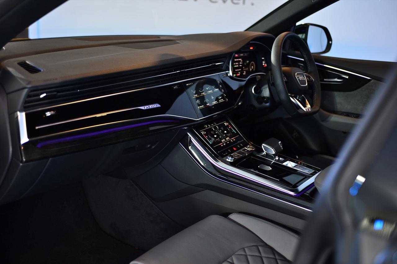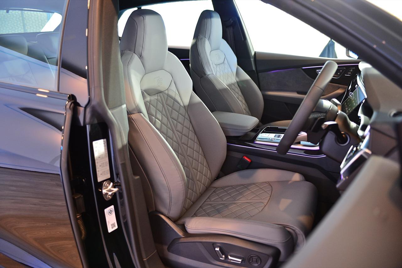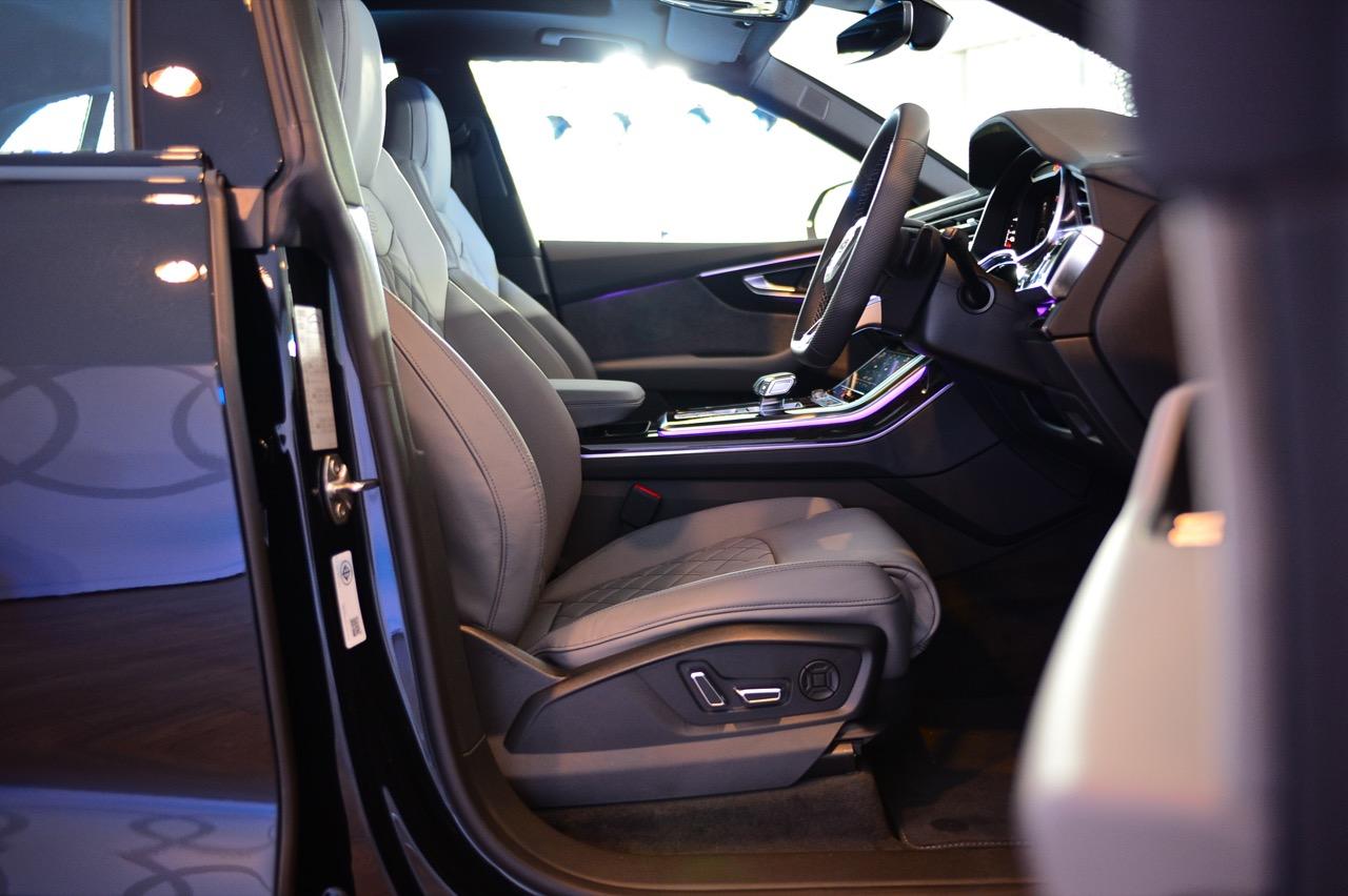 Audi Q8 60 TFSI e quattro เน้นสมรรถนะแบบสปอร์ตเอสยูวี แพ็กเกจอุปกรณ์ตกแต่งภายนอก S line Black Edition ทำให้รูปลักษณ์ดูโฉบเฉี่ยว ด้วยรายละเอียดการออกแบบที่โดดเด่นทั้งด้านหน้า ด้านข้าง และด้านหลัง แพ็กเกจ Black Edition สไตล์สีดำ ตัดกับชุดแต่งภายนอก S line ในสีเดียวกับตัวรถ ไฟหน้า Matrix LED พร้อมระบบอัตโนมัติ เป็นอุปกรณ์มาตรฐาน ระบบกันสะเทือนแบบถุงลม Adaptive Air Suspension แบบปรับระดับได้ ยางสปอร์ตขนาด 285/45 ติดตั้งบนล้อขนาด 21 นิ้ว และคาลิปเปอร์เบรกทาสีแดง แพ็กเกจ S line sport ห้องโดยสารตกแต่งด้วยสีดำ หรือบางส่วนเป็นสีเทาโรเตอร์ (บนเบาะนั่ง) ประกอบด้วยเบาะนั่งแบบสปอร์ต พร้อมลายนูนรูปตัว S แป้นเหยียบและที่พักเท้าทำจากสเตนเลส ส่วนชิ้นงานตกแต่งที่แดชบอร์ดและแผงประตูทำจากอะลูมิเนียมขัดเงาด้าน.