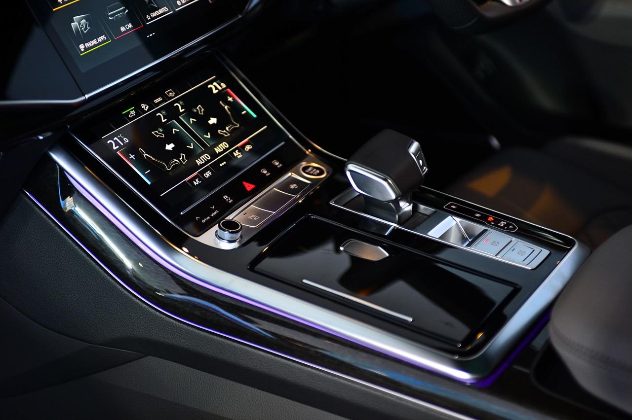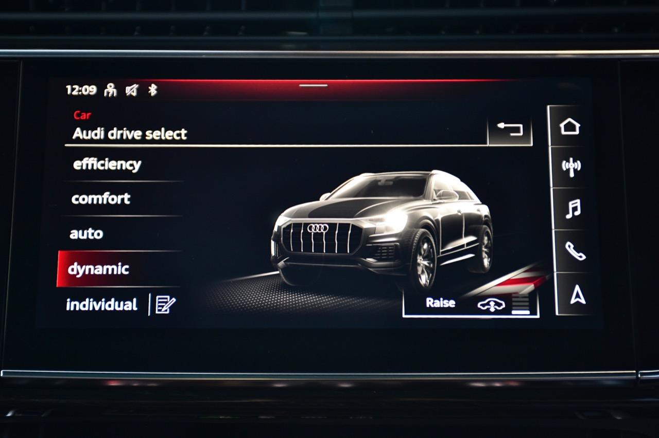 โหมดขับเคลื่อน Audi drive select ใน Audi Q8 60TFSI e quattro มีรูปแบบการขับขี่ให้เลือก 7 รูปแบบ เช่น comfort, efficiency, auto, dynamic, individual, offroad, and allroad (with adaptive air suspension sport) ระบบกันสะเทือนถุงลมแบบปรับระดับได้ Audi drive select เข้าถึงประสิทธิภาพและลักษณะการขับที่หลากหลาย เช่ือมโยงการทำงานกับเครื่อง V6 3.0 TFSI, เกียร์ tiptronic, ระบบกันสะเทือนแบบถุงลม และพวงมาลัยพาวเวอร์ไฟฟ้า วิธีการทำงานของระบบกันกระเทือนที่แตกต่างกัน ขึ้นอยู่กับการตั้งค่า ตัวอย่างเช่น เมื่อเลือกโหมดที่ตอบสองสูงสุดอย่าง Dynamic และเกียร์ tiptronic อยู่ในตำแหน่ง S มอเตอร์ไฟฟ้าเสริมแรง ให้กำลังเสริมที่ทรงพลัง ทันทีที่คนขับเร่งความเร็ว เมื่อลดความเร็ว ระบบชาร์จพลังงานกลับคืนจะทำงานในระดับสูงสุด
