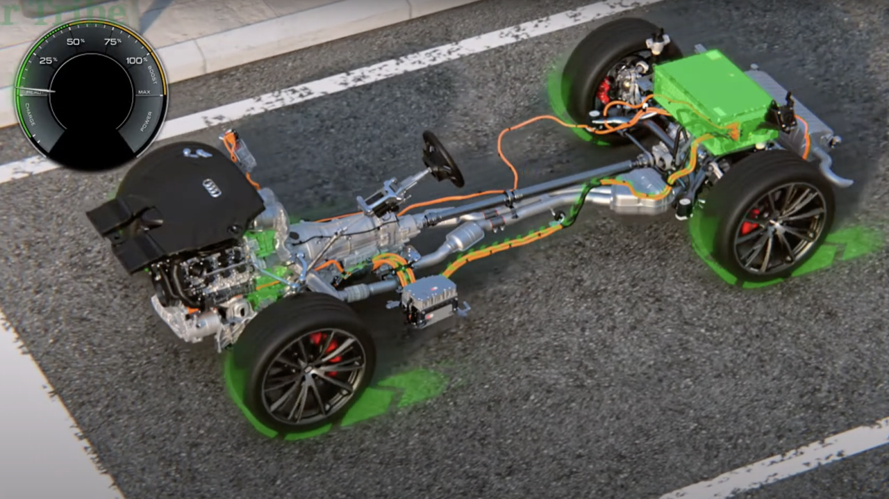 การผสมผสานกันระหว่างเครื่องยนต์และมอเตอร์ไฟฟ้า เมื่อเปิดใช้งานควบคู่ไปกับระบบนำทางและกำหนดตำแหน่งด้วยดาวเทียม MMI navigation plus หน้าที่ของมัน คือ การจัดการกับระบบชาร์จแบตเตอรี่ขณะขับเคลื่อนไปตามสภาพเส้นทางที่บันทึกอย่างชาญฉลาดและมีประสิทธิภาพ นอกจากนี้ กลยุทธ์การจัดสรรพลังงานแบบคาดการณ์ล่วงหน้า สามารถชาร์จแบตเตอรี่ด้วยเครื่องยนต์อย่างมีประสิทธิภาพ เพื่อใช้พลังงานไฟฟ้าได้อย่างเต็มที่ และเพื่อสำรองไฟไว้ใช้ ในระหว่างการขับในเมืองที่มีสภาพการจราจรติดขัด บนพื้นฐานของข้อมูลจำนวนมากที่ใช้เพื่อการนี้ Audi ได้พัฒนาระบบ MMI navigation plus ซึ่งมีการปรับปรุงอย่างต่อเนื่อง โดยใช้ข้อมูลการนำทาง สภาพแวดล้อม และข้อมูลการจราจรออนไลน์แบบเรียลไทม์