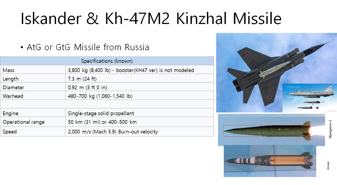 Kh-47M2 Kinzhal แปลตรงตัวว่า "กริช" เป็นขีปนาวุธอากาศสู่พื้นดินที่มีความเร็วเหนือเสียงของรัสเซีย มีพิสัยทำการไกลมากกว่า 2,000 กม. (1,200 ไมล์) ความเร็วมัค 10 และความสามารถในการหลบหลีกในทุกขั้นตอนของการบิน Kh-47M2 Kinzhal สามารถบรรทุกได้ทั้งหัวรบธรรมดาและหัวรบนิวเคลียร์ โดยบรรทุกและยิงจากเครื่องบินทิ้งระเบิด Tu-22M37 หรือเครื่องบินขับไล่สกัดกั้นความเร็วสูง MiG-31K ถูกนำไปใช้ที่ฐานทัพอากาศในเขตทหารทางใต้ของรัสเซียและเขตการทหารตะวันตก Kinzhal เป็นหนึ่งในหกอาวุธทางยุทธศาสตร์ใหม่ที่เปิดเผยโดยประธานาธิบดี Vladimir Putin เมื่อวันที่ 1 มีนาคม 2018 มีรายงานว่าขีปนาวุธดังกล่าวถูกใช้ครั้งแรกในปี 2559 ระหว่างปฏิบัติการทางทหารของรัสเซียในซีเรีย