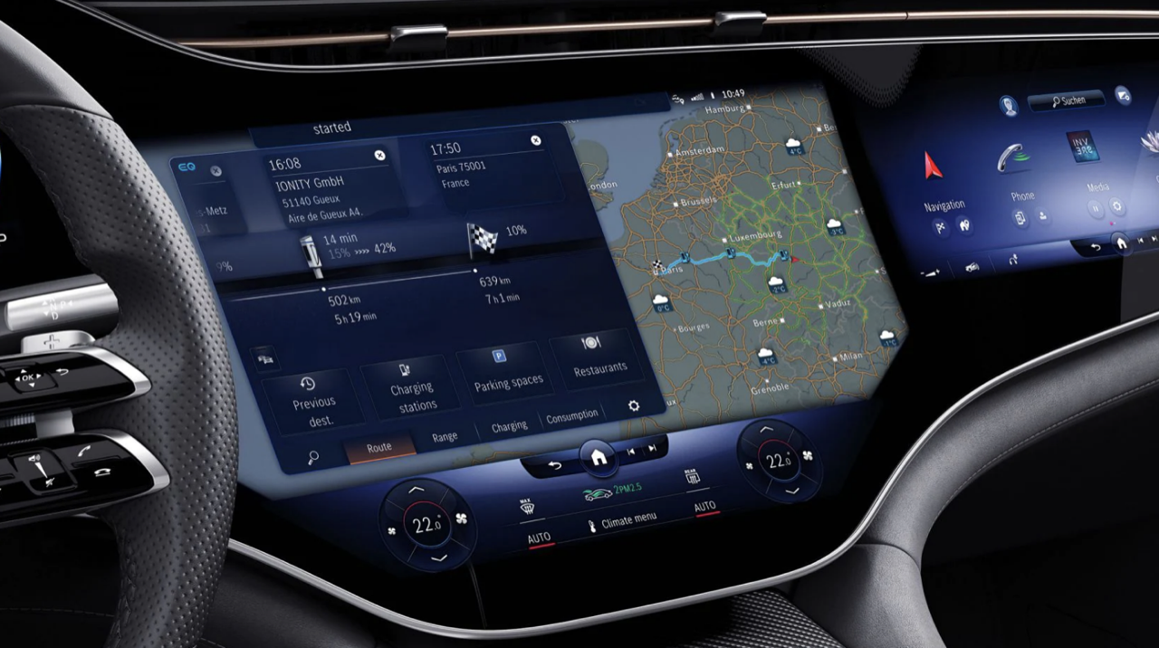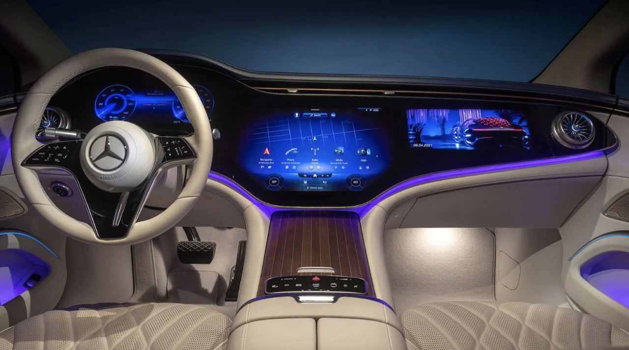 Vera Schmidt หัวหน้าแผนกออกแบบดิจิทัลขั้นสูงของ Mercedes-Benz ให้คำแนะนำว่า MBUX Hyperscreen เป็น "ก้าวสำคัญ" ในการผสมผสานการออกแบบระบบอนาล็อกและดิจิทัลผนวกเข้าด้วยกัน “การออกแบบที่เรียบง่ายและชัดเจนของจอภาพ Hyperscreen และจุดยึดที่แข็งแกร่งเชื่อมติดกับแผงแดชบอร์ดทำให้ใช้งานง่ายและตรงไปตรงมา” แพ็กเกจ MBUX High-End Rear Seat Entertainment Plus ช่วยให้เจ้าของรถพร้อมคนขับไม่พลาดการติดต่อ จอแสดงผลขนาด 11.6 นิ้ว 2 จอ พร้อมระบบควบคุมแบบสัมผัสที่ด้านหลังของพนักพิงศีรษะทั้งสอง แนบด้วยทางเลือกเพิ่มเติมกับแท็บเล็ตด้านหลังในระบบ MBUX พร้อมใช้งานทุกครั้งที่สัมผัสหน้าจอ