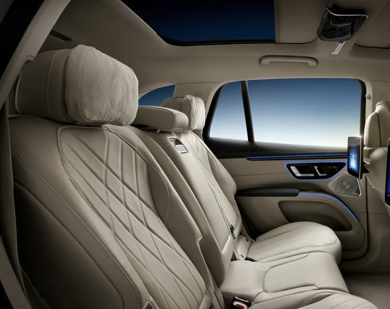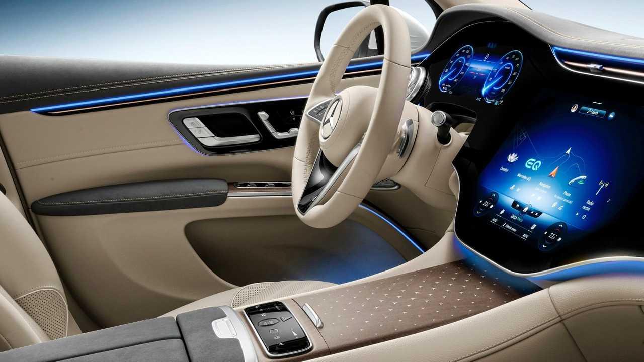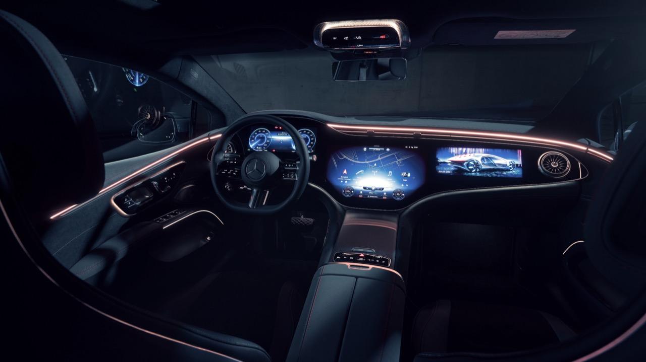 ผู้โดยสารแถวที่สองจะได้สัมผัสกับการตกแต่งภายในแบบดิจิทัลระดับสูงด้วย MBUX High-End Rear Seat Entertainment Plus ในรถยนต์ไฟฟ้า EQS รุ่นซาลูนสี่ประตู คุณลักษณะนี้ประกอบด้วยแผงหน้าจอสัมผัสขนาด 11.6 นิ้ว 2 แผง ติดตั้งบนพนักพิงที่นั่งด้านหน้า ผู้ช่วยสั่งงานด้วยเสียง Hey Mercedes สามารถใช้งานได้จากด้านหลังเช่นเดียวกันผ่านแท็บเล็ตด้านหลังด้วยระบบ MBUX พร้อมแอป Android