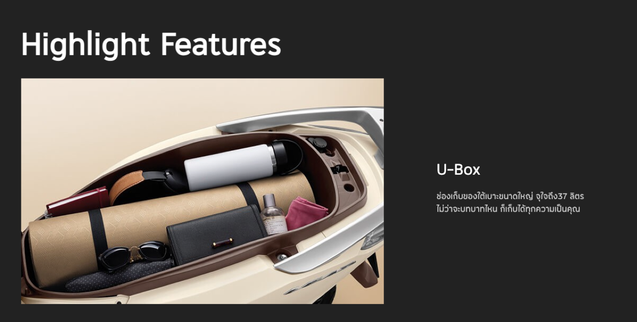 All New LEAD125 ตอบโจทย์ด้วยฟังก์ชั่นการใช้งาน กุญแจรีโมต Honda SMART Key สตาร์ตเครื่องยนต์โดยไม่ต้องใช้กุญแจ พร้อมช่วยระบุตำแหน่งตัวรถและป้องกันการโจรกรรม ช่องเก็บของด้านหน้าทรงสูง 12 ซม. มาพร้อมช่องชาร์จไฟสำรองแบบ USB Type A ถังน้ำมันด้านหน้าขนาด 6 ลิตร เติมน้ำมันโดยไม่ต้องเปิดเบาะและไม่ต้องลงจากรถ พื้นที่ใต้เบาะ U-Box บิ๊กไซส์ขนาด 37 ลิตร ใหญ่สุดในรถ เอ.ที. ขนาด 125 ซีซี ของไทย เก็บหมวกกันน็อกเต็มใบได้ 2 ใบ