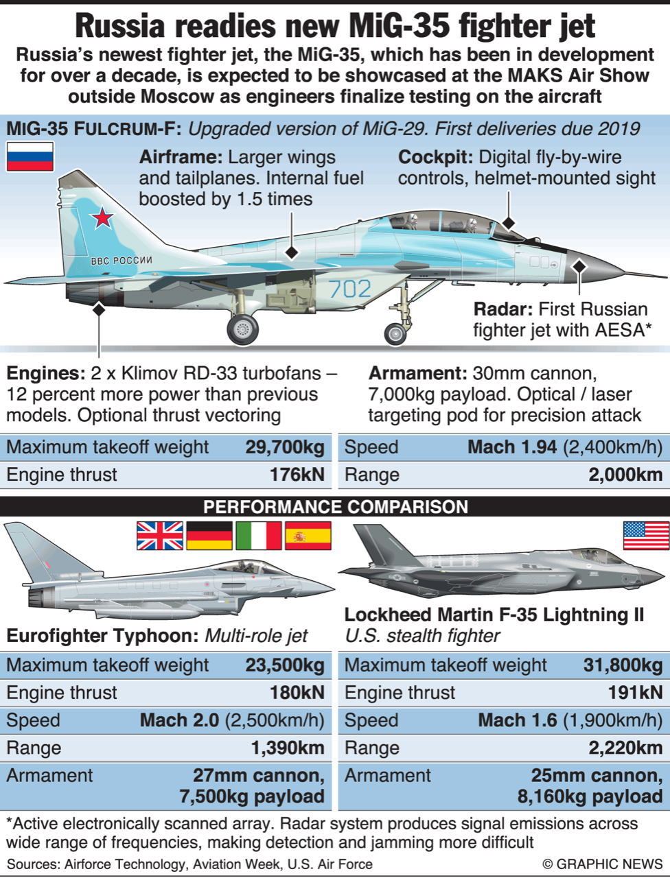 เครื่องบินขับไล่อเนกประสงค์ Mikoyan MiG-35 มีชื่อรหัสว่า "Fulcrum-F" โดยกองทัพอากาศรัสเซีย จากข้อมูลของ Defense iQ นั้น Fulcrum-F ซึ่งเปิดตัวในงานมอสโกแอร์โชว์ในปี 2560 นั้นเป็นการอัปเกรดของ มิก-29KR MiG-35 มีสองรุ่น คือ : MiG-35S และ MiG-35UB แบบแรกเป็นเครื่องบินขับไล่ที่นั่งเดี่ยว ในขณะที่รุ่นหลังเป็นแบบสองที่นั่ง ไม่เหมือนกับ MiG-29 เพราะ MiG-35 มีระบบระบุตำแหน่งด้วยแสงเลเซอร์ ที่ออกแบบมาเป็นพิเศษ ซึ่งช่วยให้เครื่องบินทำงานได้โดยไม่ต้องพึ่งพาระบบสกัดกั้นที่ควบคุมจากภาคพื้นดิน