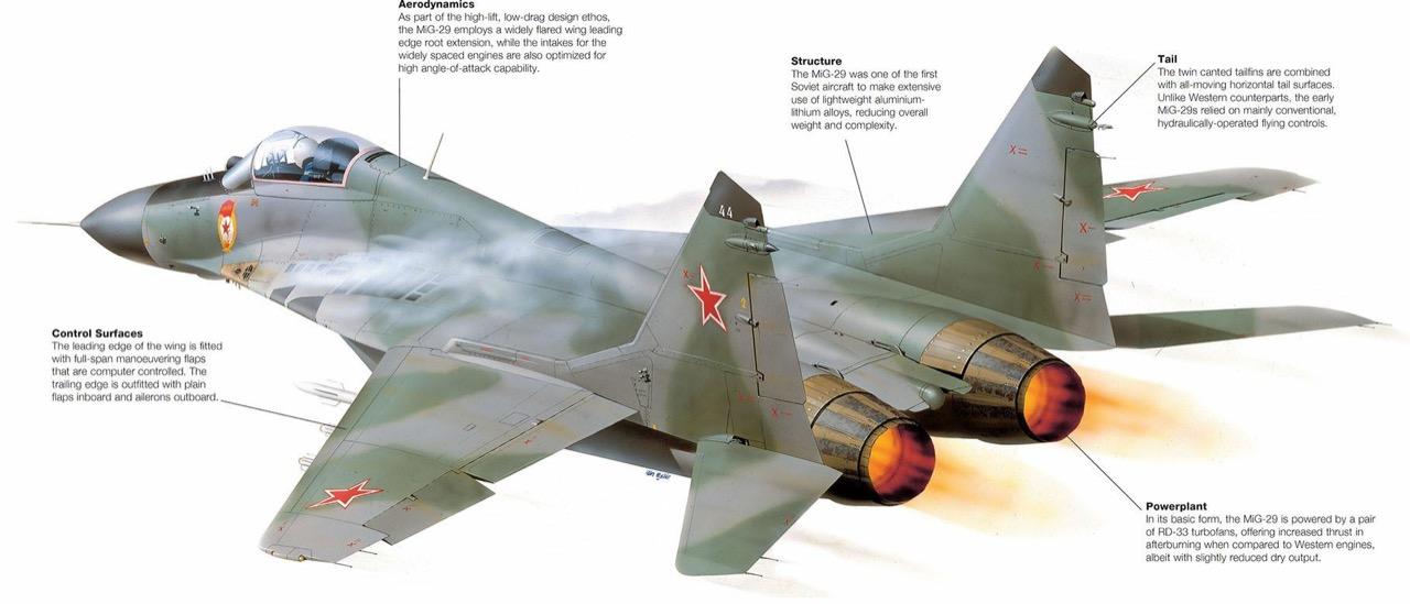Mikoyan MiG-29 ที่มีชื่อรหัสว่า "Fulcrum" ของ NATO ได้รับการพัฒนาและสร้างโดยกองทัพอากาศโซเวียตในปี 1982 เป็นเครื่องบินขับไล่แบบสองเครื่องยนต์ ที่สร้างขึ้นเพื่อตอบโต้กับเครื่องบินรบของฝั่งตะวันตกอย่าง F-16 Fighting Falcon ที่ผลิตโดยบริษัท General Dynamics ของสหรัฐอเมริกา ตั้งแต่นั้นเป็นต้นมา MiG-29 ได้กลายเป็นเครื่องบินรบที่มีความสามารถในการปฏิบัติการหลากหลาย รวมถึงการลาดตระเวน การสกัดกั้นเครื่องบินฝ่ายศัตรู และการทิ้งระเบิดทางอากาศ ในช่วงหลายปีที่ผ่านมา มีการพัฒนา MiG-29 หลายรุ่น รวมถึง Mikoyan MiG-29K ที่ใช้ลาดตะเวนทางทะเลอีกด้วย รัสเซียส่งออก MiG-29 ไปยังกว่า 30 ประเทศ รวมถึงอินเดีย บัลแกเรีย และบังกลาเทศ