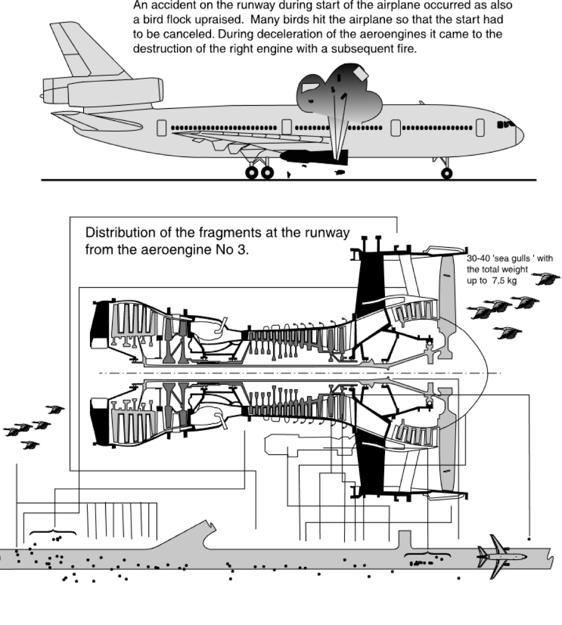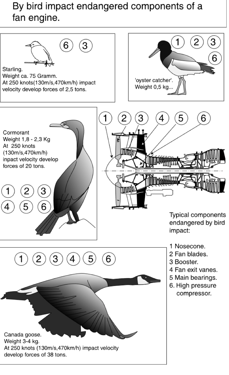 - นกนางนวล (gulls) บินชนเครื่องบินร้อยละ 30 ของอุบัติเหตุทั้งหมด เฉลี่ยความเสียหาย 1.3 ล้านเหรียญสหรัฐ