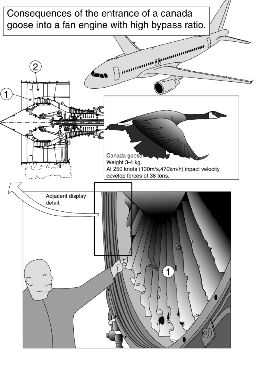 กันยายน พ.ศ. 2538 ที่สนามบิน Dulles รัฐวอชิงตัน เครื่องบิน Boeing 757 บินชนกับฝูงห่าน (Canada geese) ทำให้เครื่องยนต์ทั้งสองเครื่อง และปีกเครื่องบินได้รับความเสียหาย
