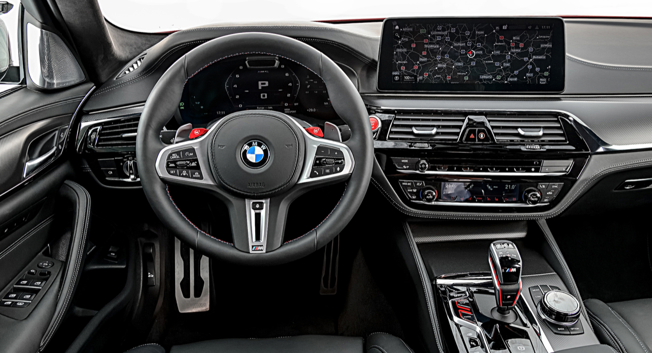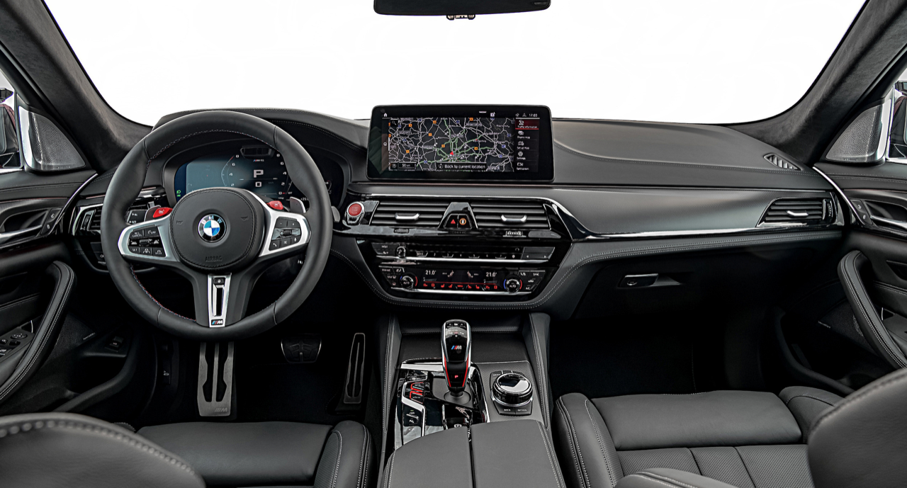 ห้องโดยสาร ติดตั้งเบาะแบบสปอร์ตของ M พวงมาลัย M หุ้มหนัง Alcantara ซุ้มเกียร์และหัวเกียร์ M แดชบอร์ดคอนโซล ตกแต่งด้วยหนัง พลาสติกและคาร์บอนไฟเบอร์ หน้าจอ Infotainment ขนาดใหญ่ 12.3 นิ้ว รองรับ Apple CarPlay และ Android Auto ระบบนำทางบนคลาวด์ ปรับปรุงเบาะและคอนโซล ปุ่มใหม่ 2 ปุ่ม ได้แก่ ปุ่ม Set Up ที่ช่วยให้เข้าถึงการตั้งค่าต่าง ๆ ในการควบคุมรถได้ง่ายขึ้น ปุ่ม M Mode สำหรับการสลับการตั้งค่าโหมดในการขับขี่ Road และ Sport ได้รวดเร็วยิ่งขึ้น BMW M5 Competition ยังมีโหมด Track ที่ให้ความรู้สึกแบบ M อย่างแท้จริงราวกับอยู่บนสนามแข่ง