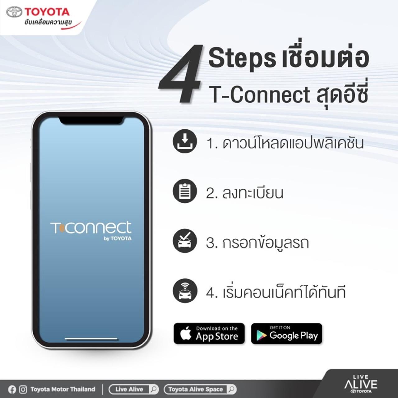 เทคโนโลยีเชื่อมต่อการขับเคลื่อนแห่งอนาคต ด้วยบริการผ่าน T-Connect Application บนมือถือที่ตอบโจทย์ทุกการเดินทาง รองรับทุกไลฟ์สไตล์ ตอบสนองการบริการที่หลากหลาย อาทิ TheftTrack บริการประสานงานติดตามรถหาย / SOS บริการช่วยเหลือฉุกเฉิน 24 ชั่วโมง / ประกันภัย PHYD : Pay How You Drive ประกันภัยขับดี ลดให้ / Toyota ALIVE-X โปรแกรมสะสมคะแนนที่ร่วมกับ The 1 และบริการอื่นๆ ที่มอบความสะดวกสบายในการดูแลรักษารถ