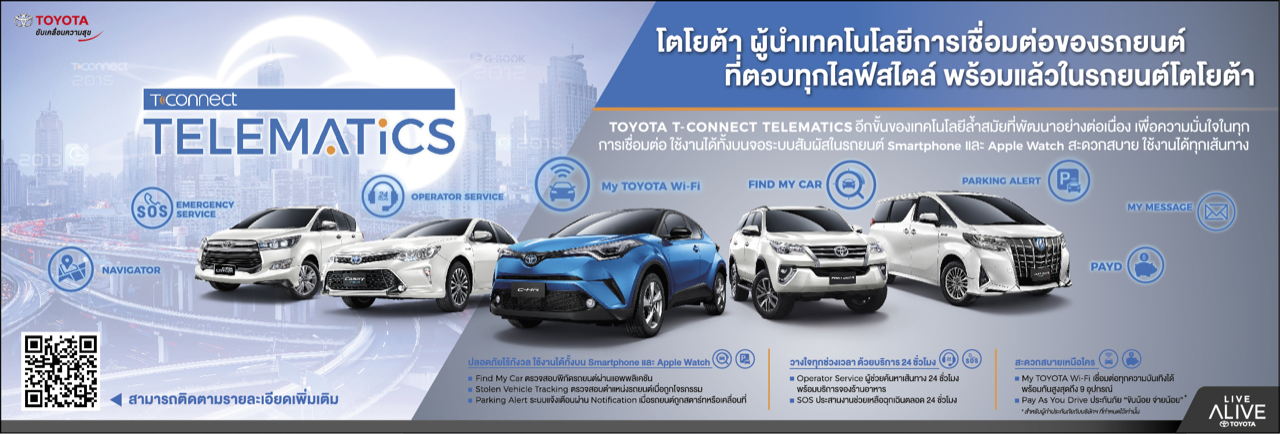 “ปัจจุบัน Toyota ได้ติดตั้งระบบ Telematics เพิ่มขึ้นในรถที่ผลิตออกขายกว่า 3 แสนคัน และคาดว่าจะครบ 1.6 ล้านคันภายในปี พ.ศ. 2568 ซึ่งได้นำ Technology Telematics มาใช้ในบริการที่เรียกว่า Connected มีทั้งหมด 8 บริการ โดยแบ่งเป็น 2 ด้านหลัก คือ ประสบการณ์การซื้อรูปแบบใหม่ (New Buying Experience) และประสบการณ์การใช้งานรูปแบบใหม่ (New Usage Experience) ทั้งนี้ เทคโนโลยี Connected คือการทำสิ่งที่เป็นไปไม่ได้ให้เป็นไปได้ ภายใต้แนวคิดของเราคือ การดูแลลูกค้าเฉพาะบุคคล การดูแลปัญหาของลูกค้าให้ดีขึ้น และการประสานกับพันธมิตร รวมถึงคู่ค้าให้ทุกฝ่ายได้ประโยชน์ร่วมกัน”