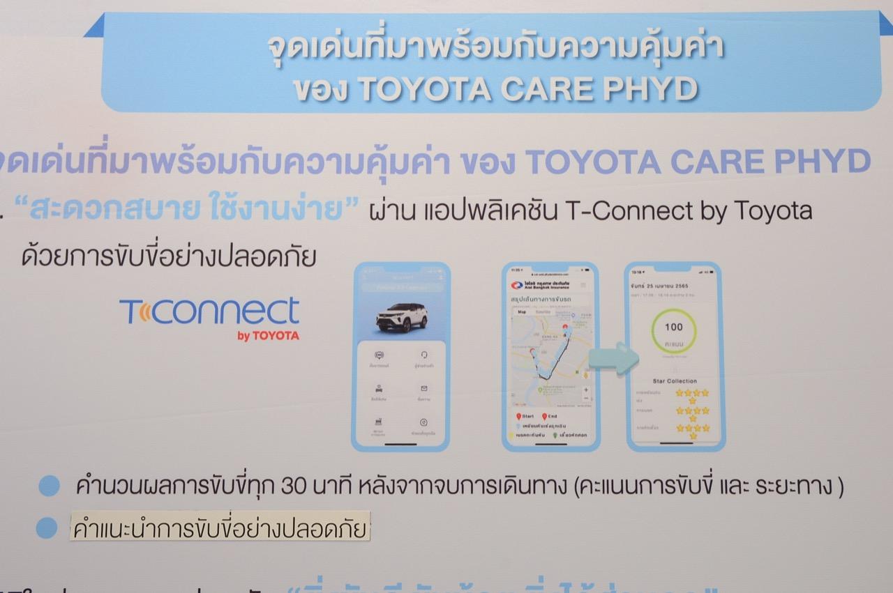 มร.ฮิเดโอะ อิวาซาวะ กรรมการผู้อำนวยการ บริษัท ไอโออิ กรุงเทพ ประกันภัย จำกัด (มหาชน) กล่าวว่า “Toyota Motor Thailand และ บริษัท ไอโออิ กรุงเทพ ประกันภัย จำกัด (มหาชน) ได้ร่วมมือกันพัฒนาการประกันภัยรถยนต์ Telematics ขึ้นเป็นครั้งแรกในประเทศญี่ปุ่น โดยได้นำข้อมูลการขับขี่มาใช้ เพื่อช่วยให้ลูกค้ามีความพึงพอใจมากยิ่งขึ้น และได้นำเสนอประกันภัยชั้น 1 Toyota CARE “ขับน้อย จ่ายน้อย” PAYD-Pay As You Drive เมื่อปีพ.ศ. 2561 ซึ่งเป็นความร่วมมือครั้งแรกกับประกันภัยระบบ Telematics กับทางโตโยต้า และพัฒนามาเป็นประกันภัยชั้น 1 Toyota CARE “ขับดี ลดให้” Toyota Care PHYD - Pay How You Drive ผ่านเทคโนโลยี Connected ใหม่ โดยจะช่วยวิเคราะห์ระยะทางการขับขี่และประมวลผลพฤติกรรมการขับขี่ออกมาเป็นคะแนนพร้อมคำแนะนำ ช่วยให้ลูกค้าขับขี่ปลอดภัย ประหยัดค่าเบี้ยประกันภัย รวมไปถึงอำนวยความสะดวกบริการแจ้งเตือนเมื่อถึงเวลาต้องต่ออายุประกันภัย”