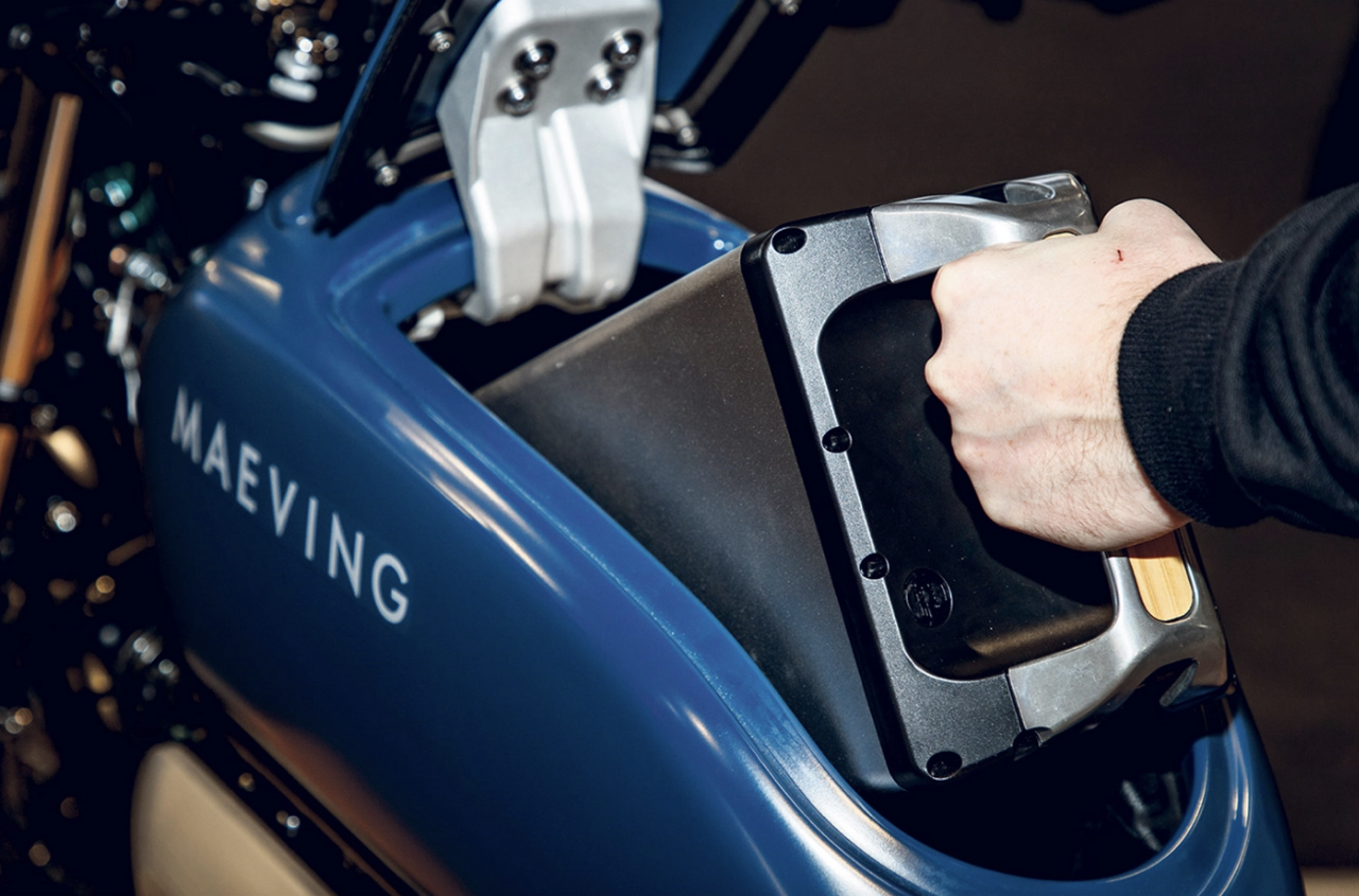 แผงด้านบนที่มีลักษณะเหมือนถังเชื้อเพลิงของ Maeving RM1 ออกแบบให้มีพื้นท่ีภายในเพื่อเก็บแพ็กแบตเตอรี่สำรอง แบตฯ แบบถอดได้ของมัน ดีไซน์มาเพื่อความสะดวกและช่วยร่นเวลากับยืดระยะทาง แบตเตอรี่สำรองที่ติดตัวไปด้วย เพื่อนำไปชาร์จที่สำนักงาน หรือชาร์จผ่านทางเต้ารับบนผนังที่บ้าน สามารถพกอุปกรณ์เสริมสำรองในถังเชื้อเพลิงหลอกขนาด 10 ลิตร เพื่อเพิ่มช่วงการชาร์จต่อครั้งเป็น 2 เท่า เนื่องจากแบตเตอรี่แต่ละก้อนให้ระยะทางในการขับขี่ได้ไกลสูงสุด 64 กิโลเมตร ต่อการชาร์จ 3.5 ชั่วโมง (ชาร์จด้วยไฟบ้านปกติ)