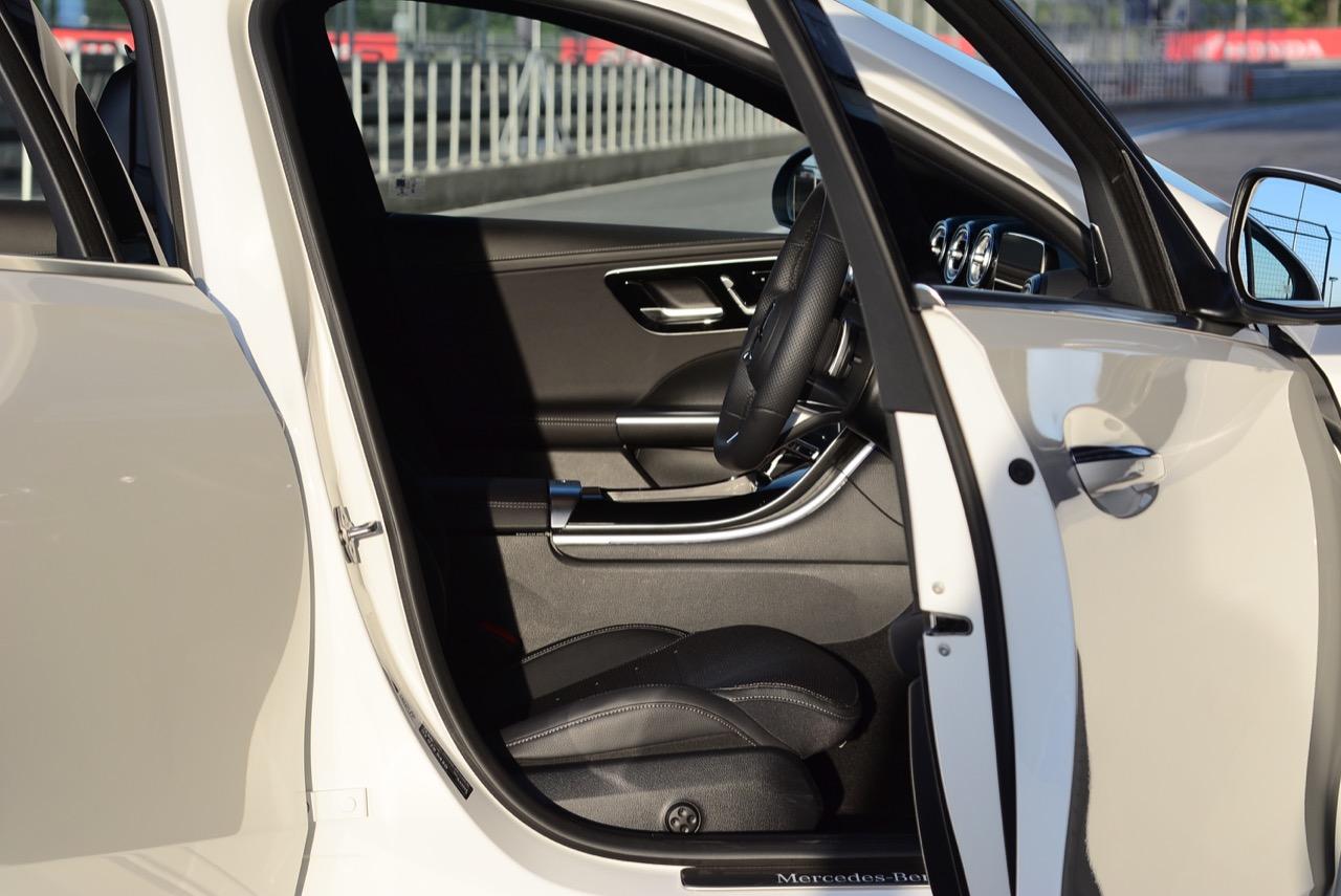 แผงประตูเรียบง่ายโดยมีปุ่มปรับตั้งเบาะพร้อมหน่วยความจำ 3 ระดับ มาให้เหมือนเดิม กรวยลำโพงที่เต็มไปด้วยรายละเอียด ปุ่มควบคุมกระจกไฟฟ้า ช่องใส่ของกระจุกกระจิก เแผงประตูตรงกลางในตำแหน่งที่วางแขนในตัวมีการพัฒนาจากพื้นผิวแนวตั้งเป็นแนวนอน สะท้อนการออกแบบให้เชื่อมโยงกับคอนโซลกลาง สามารถใช้เป็นที่จับหรือปิดได้ การออกแบบเบาะนั่งใน C-Class ใหม่ ใช้ชั้นและพื้นผิวที่อ่อนนุ่มห่อหุ้มด้วยหนังแท้ พนักพิงศีรษะได้รับการออกแบบใหม่ทั้งหมด โดยใช้การยึดติดตัวเบาะเข้ากับพนักพิงด้วยแท่งพลาสติก แดชบอร์ดที่หุ้มด้วย MB-Tex พร้อมเส้นคาดที่ทำให้มีความหรูหรา สำหรับ C-Class เวอร์ชัน AMG Dynamic แสดงพื้นผิวที่เป็นนวัตกรรมใหม่ มีแผ่นอะลูมิเนียมฝังอยู่ตามส่วนโค้งของแผงหน้าปัด จอภาพมาตรวัดและจอแสดงผลกลางที่คล้ายกับ S-Class ใหม่ รูปทรงของจอภาพมาตรวัด ถูกปรับให้เข้ากับการแสดงผลแบบใหม่ถึงสามรูปแบบ (แบบ Sport / Classic / คลาสสิก และแบบ Normal) อีกสามโหมดสำหรับการแสดงผลในระบบนำทางดิจิทัล ระบบความปลอดภัย การตั้งค่า ใน "สปอร์ตโหมด" จอภาพมาตรวัดใช้โทนสีแดงที่เร้าใจ วัดรอบเครื่องยนต์และวัดความเร็วแสดงผลเป็นตัวเลขอยู่ตรงกลาง C-Class ใหม่ยังมาพร้อมกับระบบแสง Ambient Light LED ตกแต่งภายในปรับเปลี่ยนเฉดสีได้ 64 สี