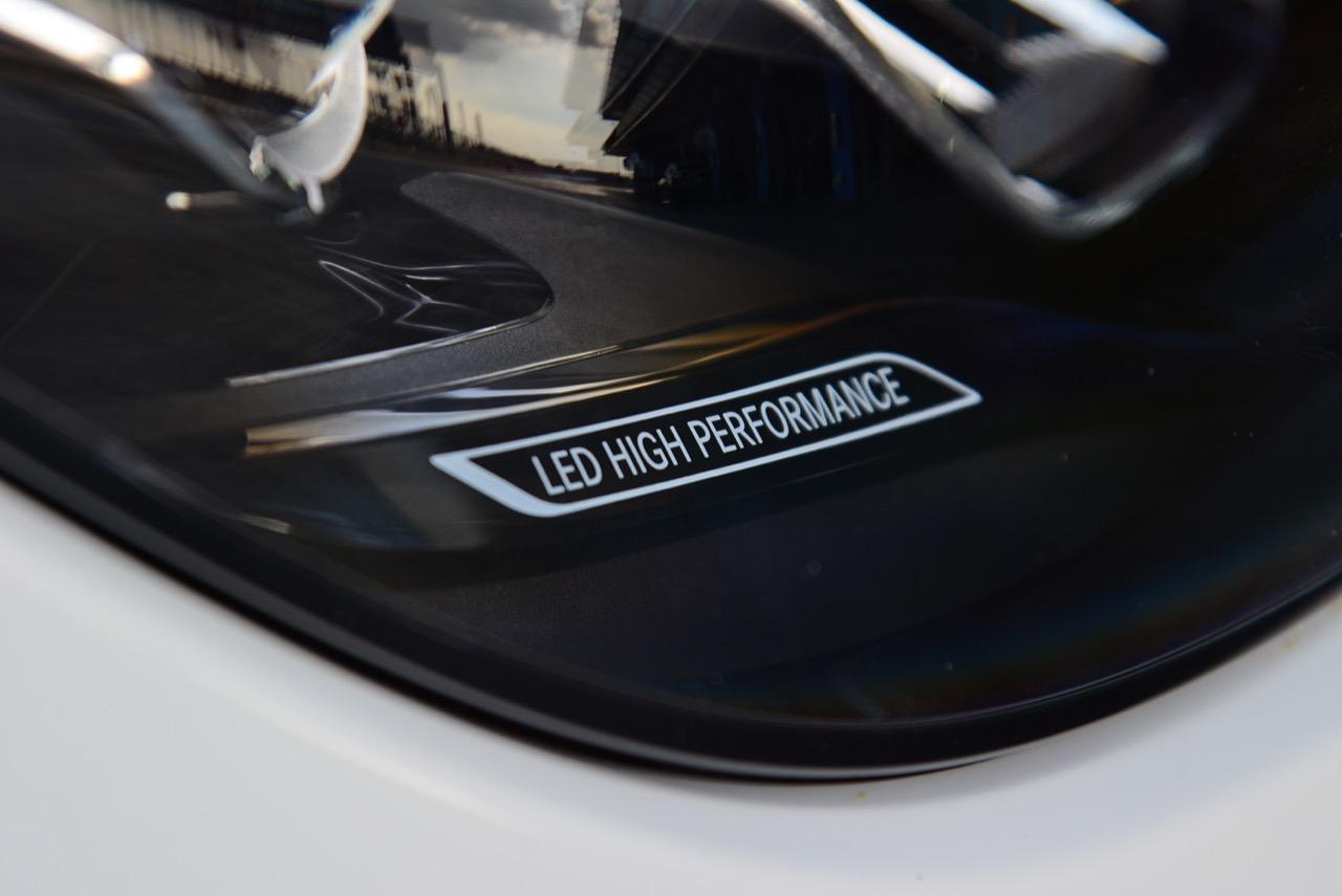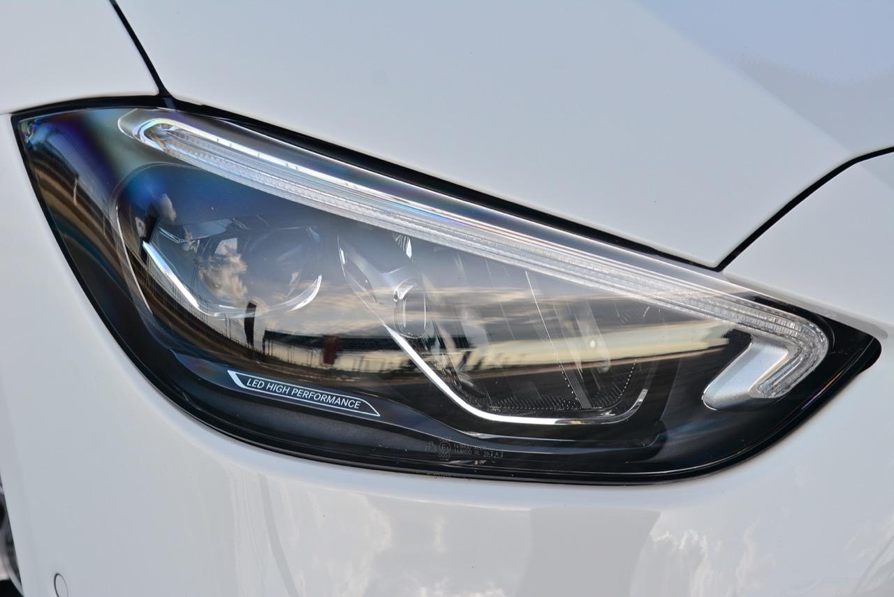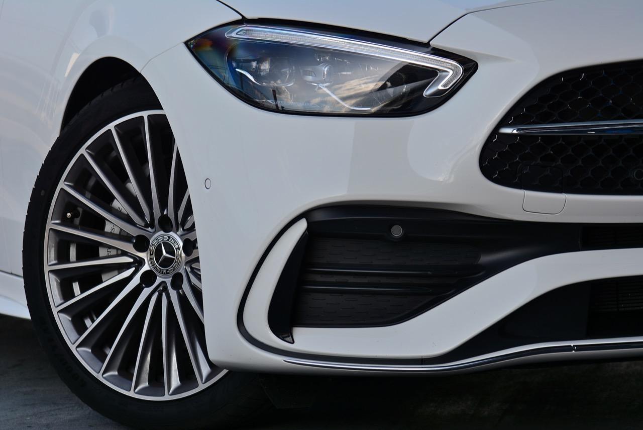กระจังหน้าของ C220d รุ่น AMG Dynamic ประดับประดาด้วยดาวสามแฉกชิ้นเล็กๆ ประดับประดาอยู่บนชุดกระจังแบบใหม่ New C-Class ทุกรุ่นมีกระจังหน้าที่ติดตั้งตราสัญลักษณ์ดาวสามแฉกตรงกลาง การออกแบบใหม่ในลักษณะของกระจังหน้าที่มีความแตกต่างกันในรายละเอียด ไฟหน้า LED พร้อมไฟหรี่ LED Daytime Running Light น่าเสียดายอยู่เหมือนกันที่ C220d AMG Dynamic ไม่มีระบบไฟ Multi Beam LED โดยแทนที่ด้วยไฟหน้า LED High Performance Headlamps กันชนหน้ามีองค์ประกอบของชิ้นงานตกแต่งในช่องระบายอากาศ ขณะที่กระจังหน้าและกันชนหน้าตกแต่งด้วยโครเมียม รุ่น AMG Dynamic คือกระจังหน้าเพชรที่โดดเด่นจากดีไซน์รูปดาวดวงเล็กๆ สะท้อนแสงด้วยพลาสติกพื้นผิวโครเมียม