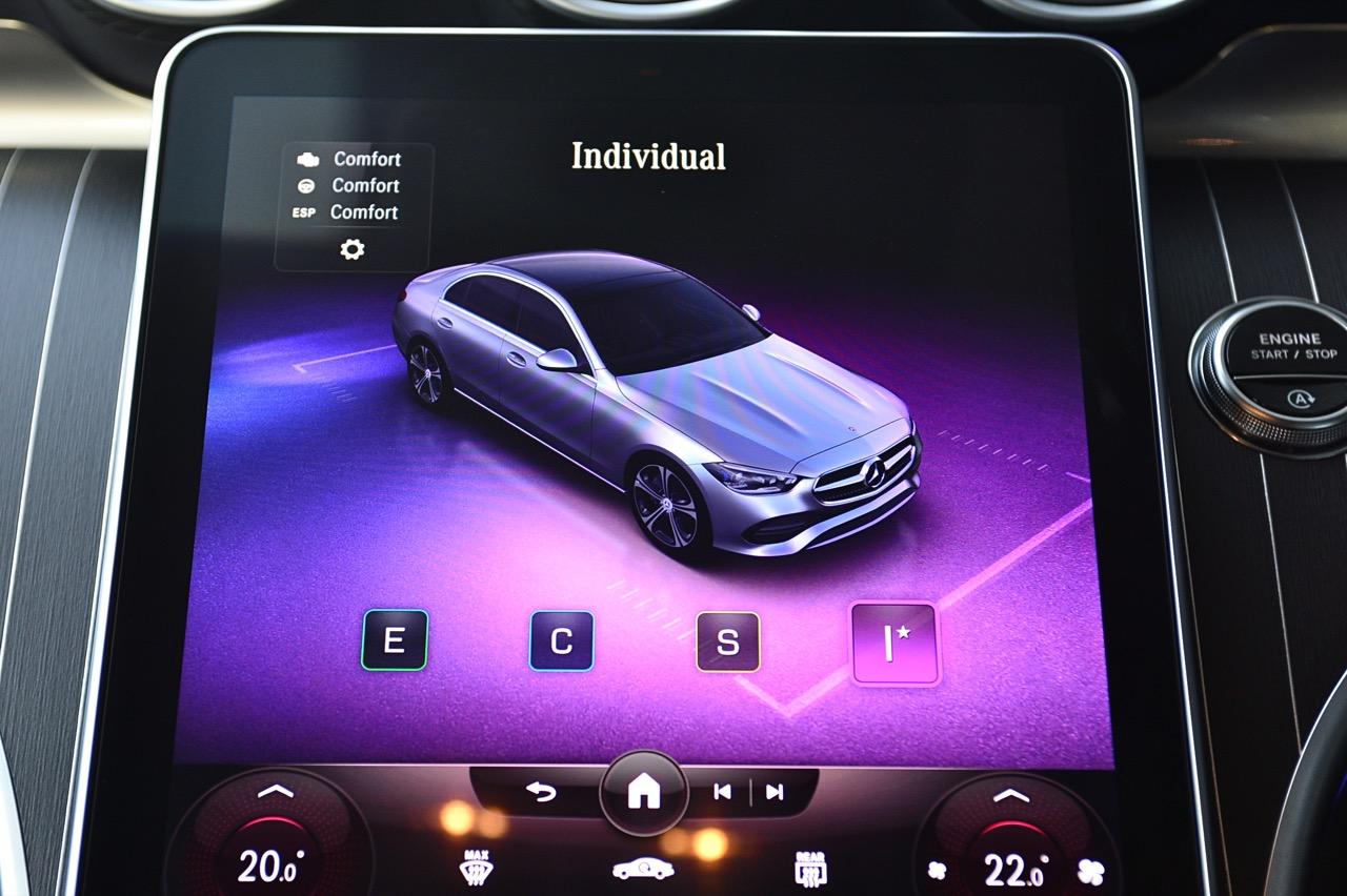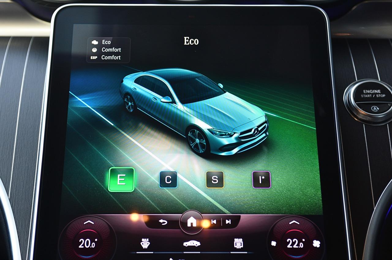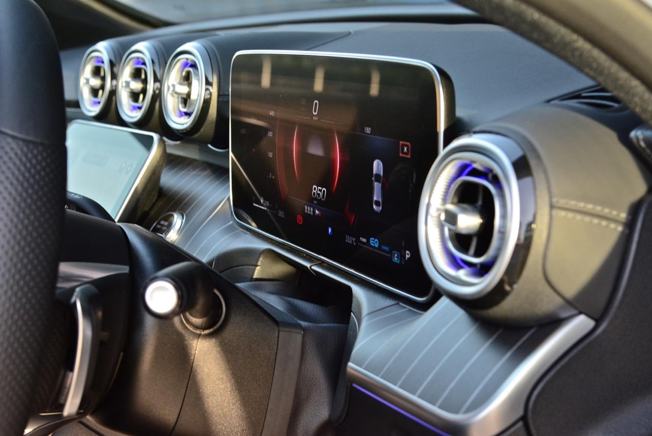 การเปลี่ยนกระบวนทัศน์ไปสู่ระบบดิจิทัลยุคใหม่ ปรากฏอยู่ในจอแสดงผลส่วนกลางที่คล้ายกับ New S-Class จอกลางแนวตั้ง สามารถควบคุมและแสดงผลการทำงานของระบบต่างๆ การปรับตั้งและเชื่อมต่อฯ ผ่านการสั่งงานบนหน้าจอระบบสัมผัสคุณภาพสูง การวางจอภาพในแนวตั้งทำให้มองเห็นได้ชัดเจนและเกิดประโยชน์สูงสุดเมื่อใช้ระบบนำทางด้วยดาวเทียมหรือกล้องมองรอบคัน หน้าจอสัมผัสออกแบบให้ดูเหมือนลอยอยู่เหนือแดชบอร์ด เช่นเดียวกับชุดแดชบอร์ดที่หรูหรา หน้าจอมอนิเตอร์กลางปรับองศาให้เอียงเล็กน้อยไปทางคนขับ จอแสดงผลส่วนกลางขนาด 11.9 นิ้ว เป็นอุปกรณ์มาตรฐานของ New C-Class ทุกรุ่นอีกด้วย จอแสดงผลส่วนกลางยังมีการตกแต่งที่ลงลึกในด้านรายละเอียด เช่น การล้อมรอบจอภาพด้วยสีดำเงาวาวและขอบสีเงินที่ตัดกับสีดำและขยายไปยังคอนโซลกลางได้อย่างลงตัว รายละเอียดการตกแต่งที่ประณีต การตัดขอบด้วยโครเมียมคุณภาพสูง ช่วยให้ห้องโดยสารของ C220d AMG Dynamic น่ามองมากยิ่งขึ้นและเหมือนกับห้องโดยสารของ New S-Class ที่ถูกย่อสัดส่วน