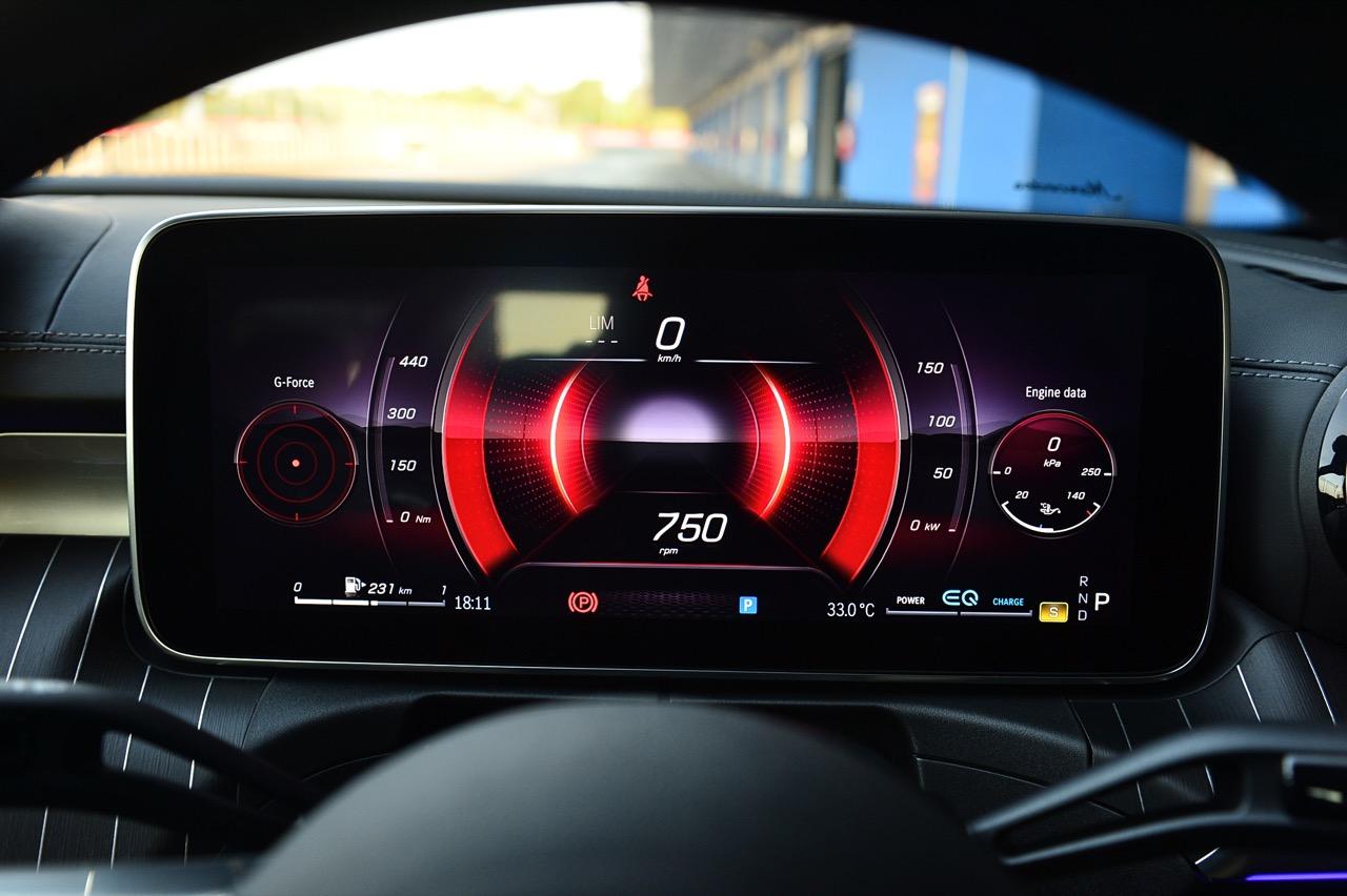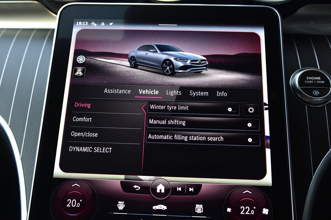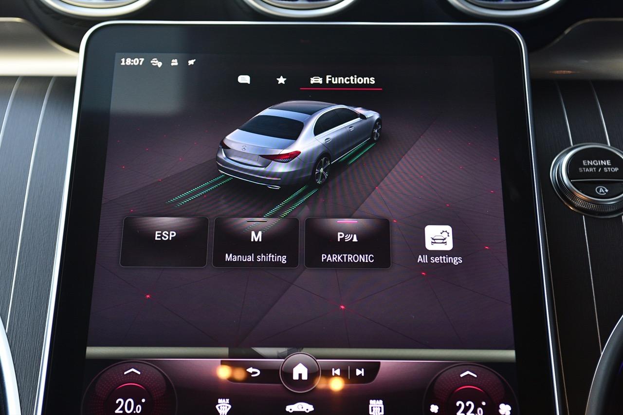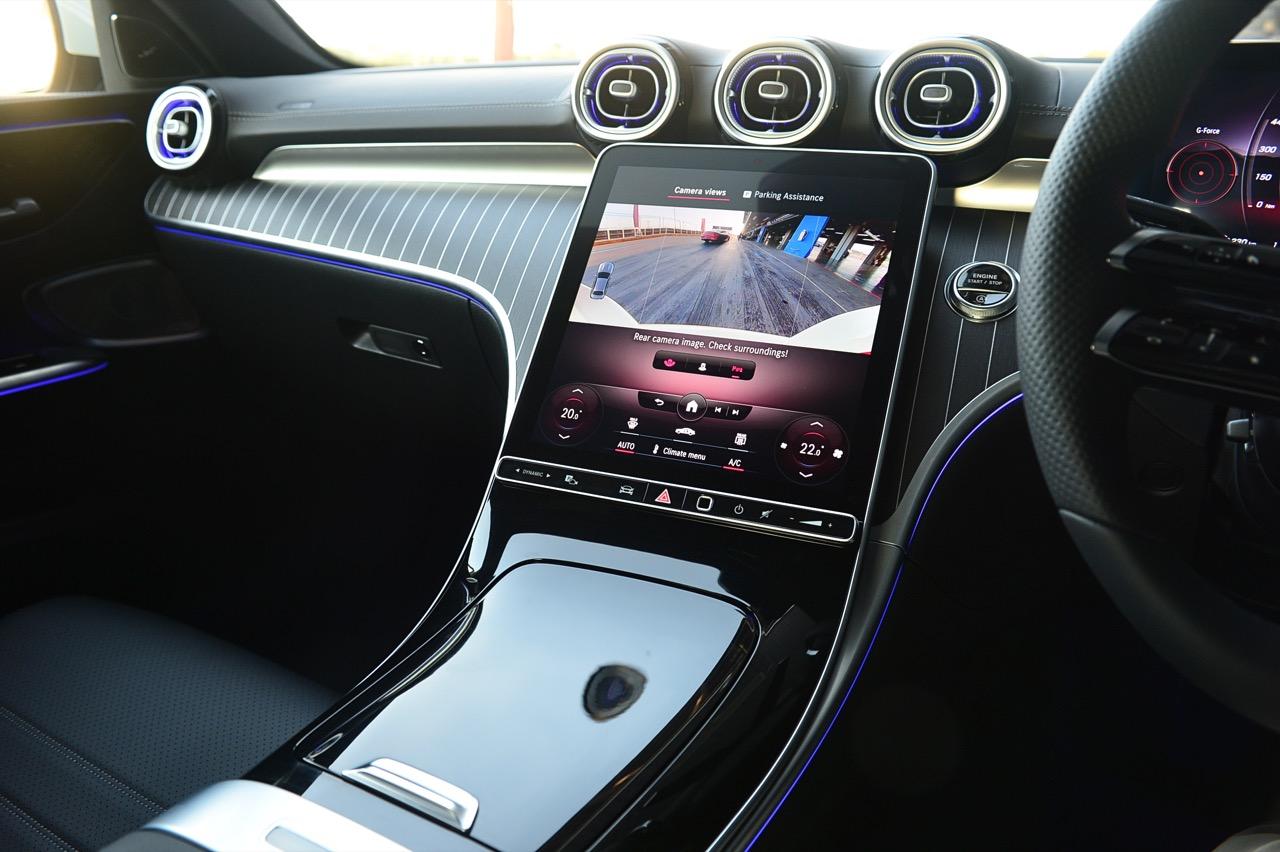 การเปลี่ยนกระบวนทัศน์ไปสู่ระบบดิจิทัลยุคใหม่ ปรากฏอยู่ในจอแสดงผลส่วนกลางที่คล้ายกับ New S-Class จอกลางแนวตั้ง สามารถควบคุมและแสดงผลการทำงานของระบบต่างๆ การปรับตั้งและเชื่อมต่อฯ ผ่านการสั่งงานบนหน้าจอระบบสัมผัสคุณภาพสูง การวางจอภาพในแนวตั้งทำให้มองเห็นได้ชัดเจนและเกิดประโยชน์สูงสุดเมื่อใช้ระบบนำทางด้วยดาวเทียมหรือกล้องมองรอบคัน หน้าจอสัมผัสออกแบบให้ดูเหมือนลอยอยู่เหนือแดชบอร์ด เช่นเดียวกับชุดแดชบอร์ดที่หรูหรา หน้าจอมอนิเตอร์กลางปรับองศาให้เอียงเล็กน้อยไปทางคนขับ จอแสดงผลส่วนกลางขนาด 11.9 นิ้ว เป็นอุปกรณ์มาตรฐานของ New C-Class ทุกรุ่นอีกด้วย จอแสดงผลส่วนกลางยังมีการตกแต่งที่ลงลึกในด้านรายละเอียด เช่น การล้อมรอบจอภาพด้วยสีดำเงาวาวและขอบสีเงินที่ตัดกับสีดำและขยายไปยังคอนโซลกลางได้อย่างลงตัว รายละเอียดการตกแต่งที่ประณีต การตัดขอบด้วยโครเมียมคุณภาพสูง ช่วยให้ห้องโดยสารของ C220d AMG Dynamic น่ามองมากยิ่งขึ้นและเหมือนกับห้องโดยสารของ New S-Class ที่ถูกย่อสัดส่วน