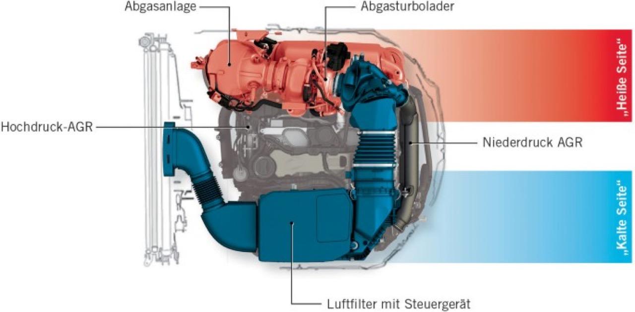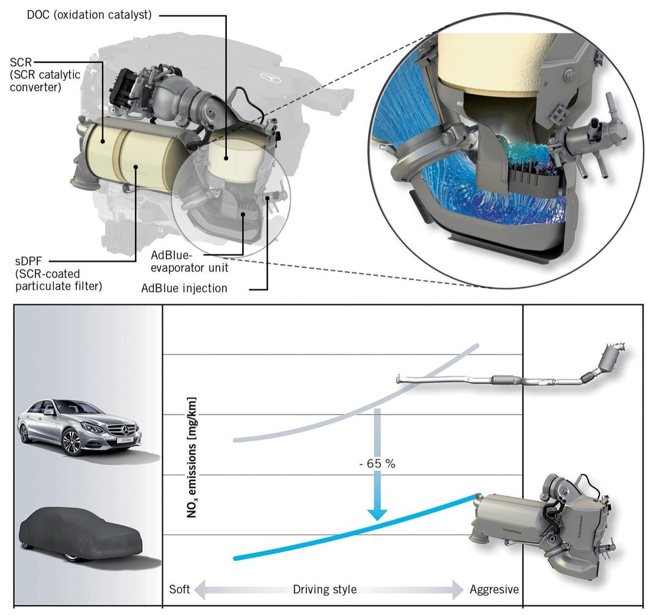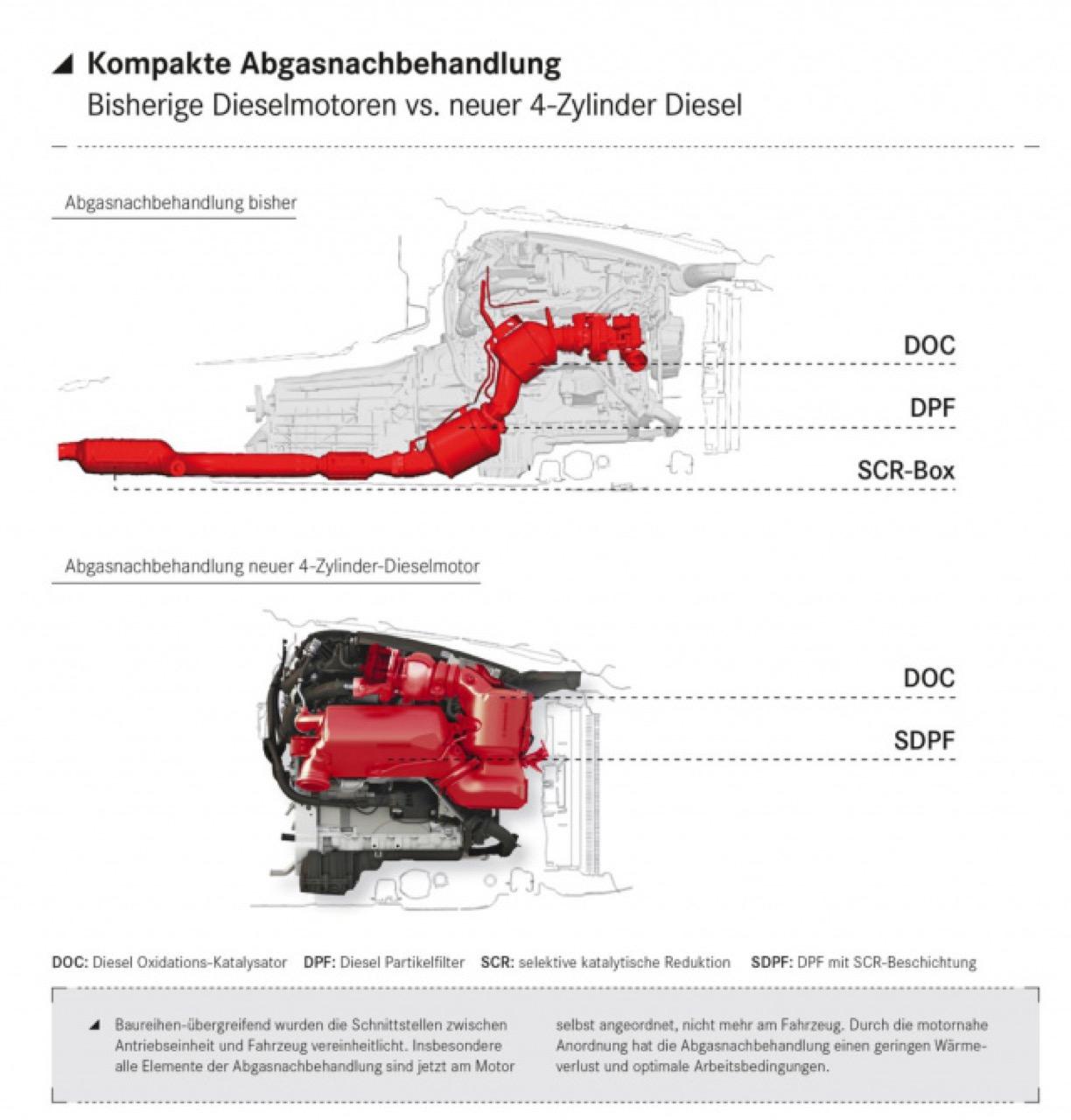 เพลาข้อเหวี่ยงแบบใหม่ ช่วยเพิ่มพื้นที่ว่างด้านไอเสียของบล็อก สำหรับระบบปล่อยมลพิษขนาดกะทัดรัดแบบใหม่ ที่ติดตั้งกับเครื่องยนต์โดยตรง การปรับตั้งที่มีประสิทธิภาพ ทำให้ไม่จำเป็นต้องใช้ระบบการปล่อยมลพิษเฉพาะรถยนต์ อุปกรณ์ประกอบด้วย ตัวเร่งปฏิกิริยาออกซิเดชันดีเซล และตัวกรองอนุภาคดีเซล การเคลือบตัวเร่งปฏิกิริยา ฉนวน และติดตั้งในตำแหน่งที่ใกล้เครื่องยนต์ของ diesel particulate filter (DPF) ทำให้ระบบสูญเสียความร้อนต่ำ มีการปรับอุณหภูมิการทำงานให้เหมาะสม ทำให้ปล่อยมลพิษลดลง และประหยัดเชื้อเพลิงเพิ่มขึ้น DPF มีพื้นที่ผสม พัฒนาขึ้นเป็นพิเศษสำหรับไอเสียที่เกิดจากการเผาไหม้น้ำมันดีเซล เพื่อกระจายไปยังตัวกรองอนุภาคไอเสียอย่างสม่ำเสมอ และระเหยอย่างรวดเร็วเพื่อลดการปล่อย NOx นอกจากนี้ ยังใช้วาล์วหมุนเวียนไอเสียแบบหลายทาง โดยผสมผสานก๊าซแรงดันสูงและแรงดันต่ำที่ระบายความร้อนด้วยระบบทำความเย็น เพื่อลดการปล่อยไอเสียที่ไม่ผ่านการบำบัดตลอดช่วงรอบต่อนาที ในขณะที่มีการปรับการเผาไหม้เพื่อให้เหมาะสมกับอัตราสิ้นเปลือง นั่นก็คือ เน้นความประหยัดเชื้อเพลิง