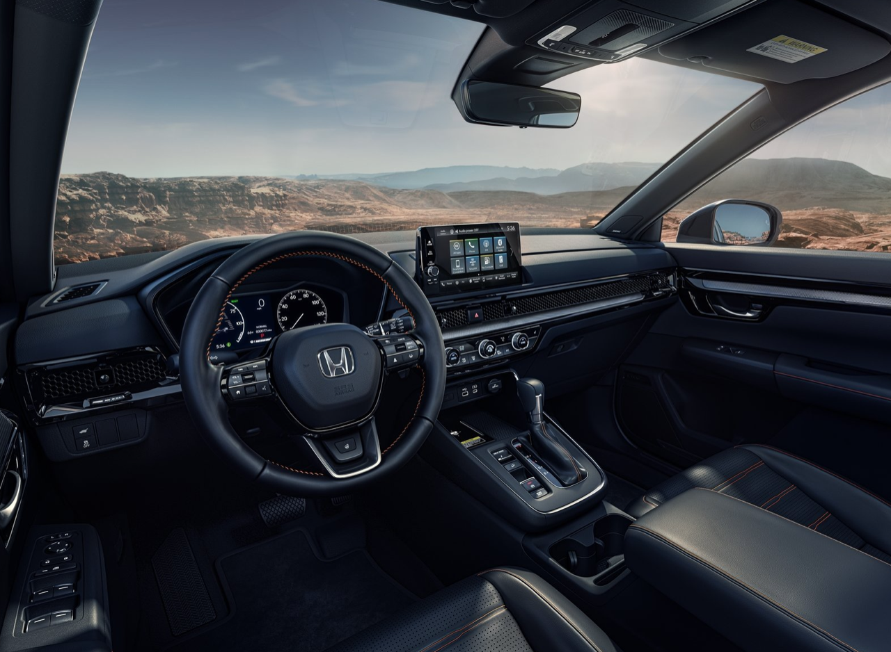 Honda CR-V รุ่นใหม่ปี 2023 จะมีการตกแต่งภายในที่เรียบง่าย สอดคล้องกับปรัชญาของแบรนด์ มีการออกแบบแดชบอร์ดที่บางกว่าเดิม คอนโซลกลางย้ายตำแหน่งหน้าจอระบบสาระบันเทิง ลดจำนวนการควบคุมทางกายภาพ Honda ติดตั้งแผงหน้าจอสัมผัสบนแผงหน้าปัด ทำให้เข้าถึงข้อมูลและการปรับตั้งต่างๆ ได้ง่ายขึ้น ในขณะที่ยังคงรักษาความเรียบของคอนโซล การเปลี่ยนแปลงที่สำคัญอีกประการหนึ่งคือการนำแผงหน้าปัดดิจิทัลมาใช้อย่างเต็มรูปแบบ แทนที่มาตรวัดแบบเข็มที่ใช้มานาน แผงหน้าปัดของ CR-V ปี 2023 เกือบจะเหมือนกับ New Civic ช่องแอร์ ซ่อนอยู่หลังกรอบตาข่ายทรงสี่เหลี่ยมผืนผ้า ชิ้นส่วนขนาดกะทัดรัดที่ด้านคนขับ และชิ้นส่วนที่กว้างเป็นพิเศษ ทอดยาวจากปลายอีกด้านของพวงมาลัยไปยังปลายอีกด้านของแผงหน้าปัด มีปุ่มเล็กๆ สี่ปุ่มที่ออกแบบคล้ายอุปกรณ์ความบันเทิงภายในบ้านระดับไฮเอนด์ เพื่อปรับทิศทางการไหลของอากาศ คอนโซลกลางเป็นของใหม่ แต่มีคันเกียร์ที่คุ้นเคย แทนคันเกียร์แบบปุ่มหรือแบบแป้นหมุนที่ทันสมัยกว่า Honda ยังคงปรับแต่งแบบอนุรักษนิยม สำหรับลูกค้าเก่าที่เริ่มมีอายุมากขึ้น และปรับจูนให้อุปกรณ์ใน CR-V ใช้งานง่าย ในขณะที่ยังประหยัดต้นทุนการผลิตด้วยส่วนประกอบทางกลไกแบบเดิม