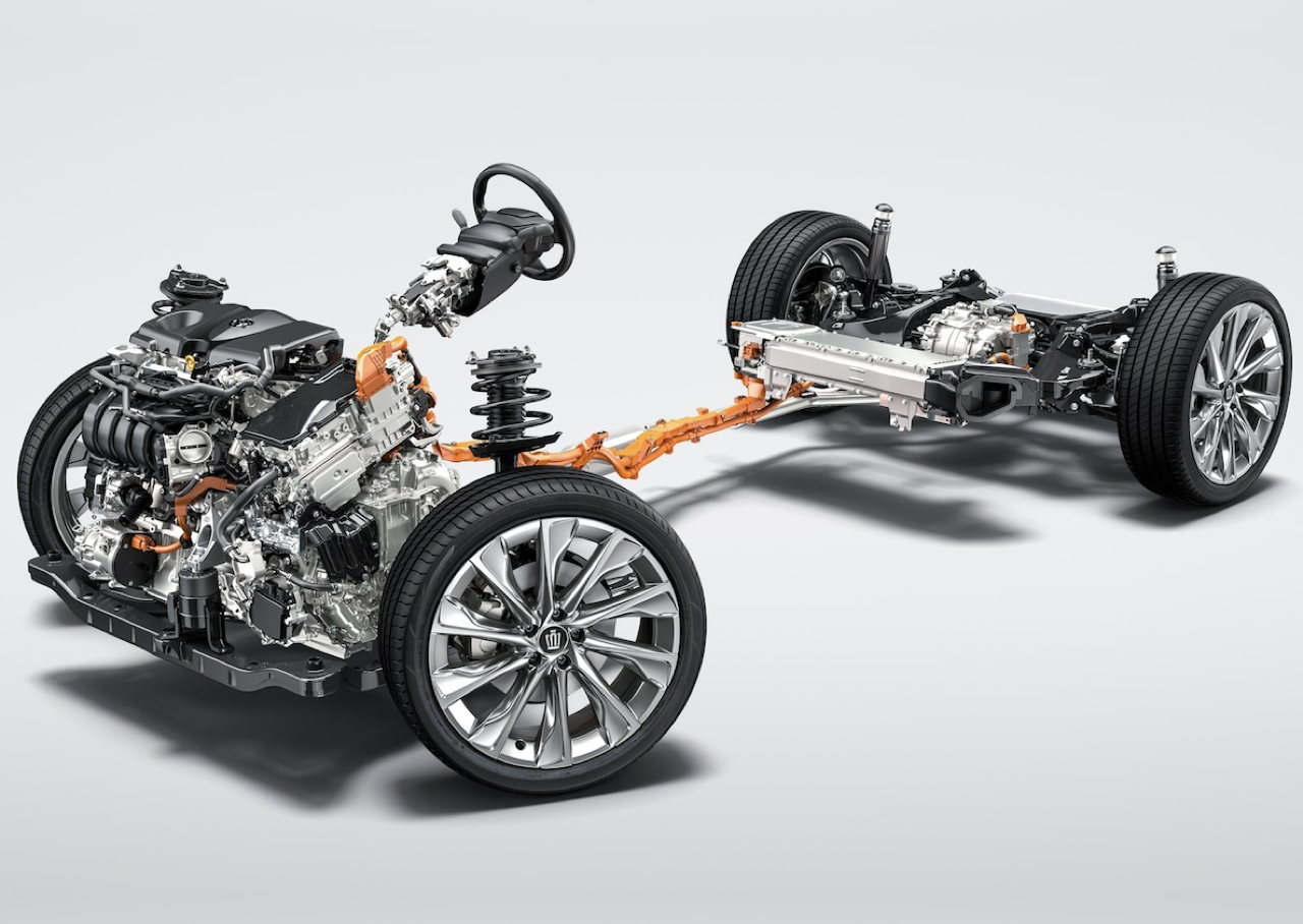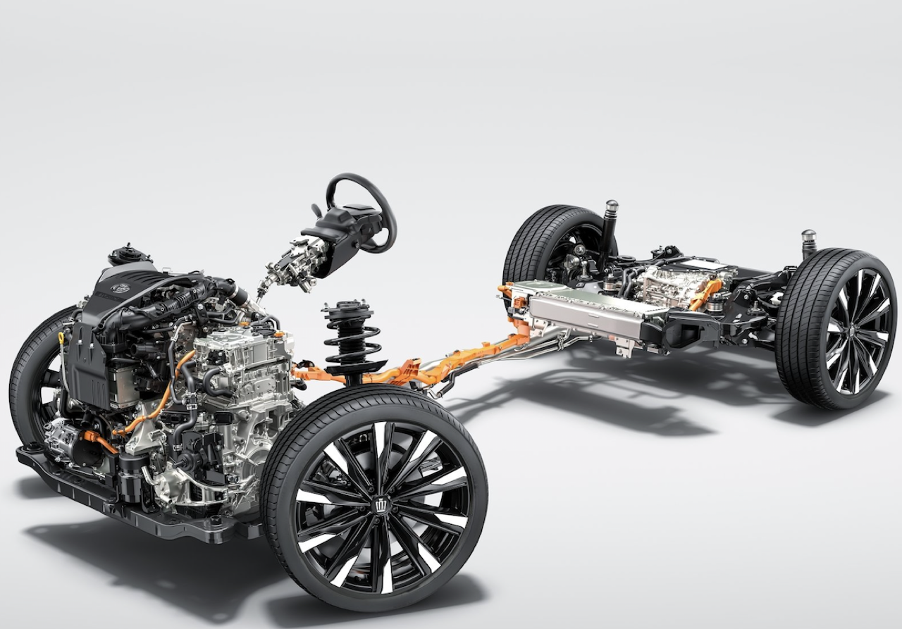 E-Four Advanced AWD ที่จับคู่กับเครื่องยนต์ HYBRID MAX ใน Crown Platinum ส่งกำลังไปยังล้อหน้าและล้อหลัง ผ่านมอเตอร์ไฮบริดที่ติดตั้งด้านหน้า และไปยังล้อหลังด้วยมอเตอร์ไฟฟ้า eAxle ที่ติดตั้งด้านหลัง ระบบนี้ช่วยให้มั่นใจถึงประสิทธิภาพของชุดขับสี่ AWD ที่เสถียร การเร่งความเร็วกับอัตราทดของเกียร์อัตโนมัติ 6 สปีด direct shift ในระบบ E-Four Advanced แรงขับเคลื่อนล้อหน้าและล้อหลัง จะถูกควบคุมอย่างแม่นยำระหว่าง 70:30 ถึง 20:80 มอเตอร์ด้านหลังซึ่งสร้างกำลังแรงบิดใช้การระบายความร้อนด้วยน้ำ สามารถเพิ่มแรงบิดสูงสุดให้กับล้อหลังได้ ระบบ AWD ใหม่นี้ ช่วยเพิ่มแรงขับเคลื่อนของล้อหลังและให้ความรู้สึกถึงความคล่องแคล่วในการขับเคลื่อนผ่านล้อคู่หลัง การทรงตัวในแนวตรง การเลี้ยวที่มั่นคง และการเร่งความเร็วจากจุดหยุดนิ่งที่ดีกว่าเดิม