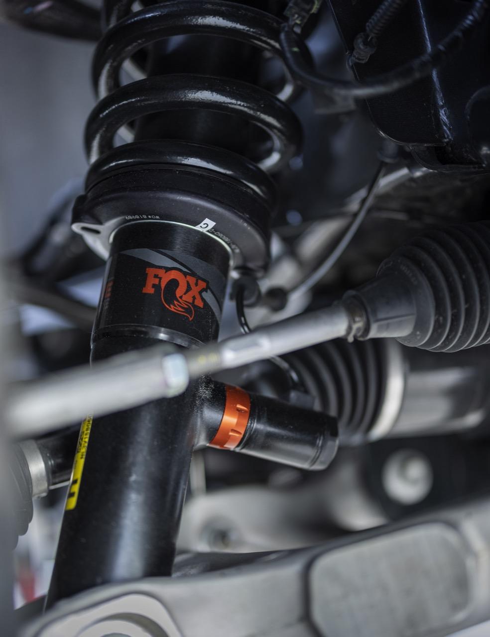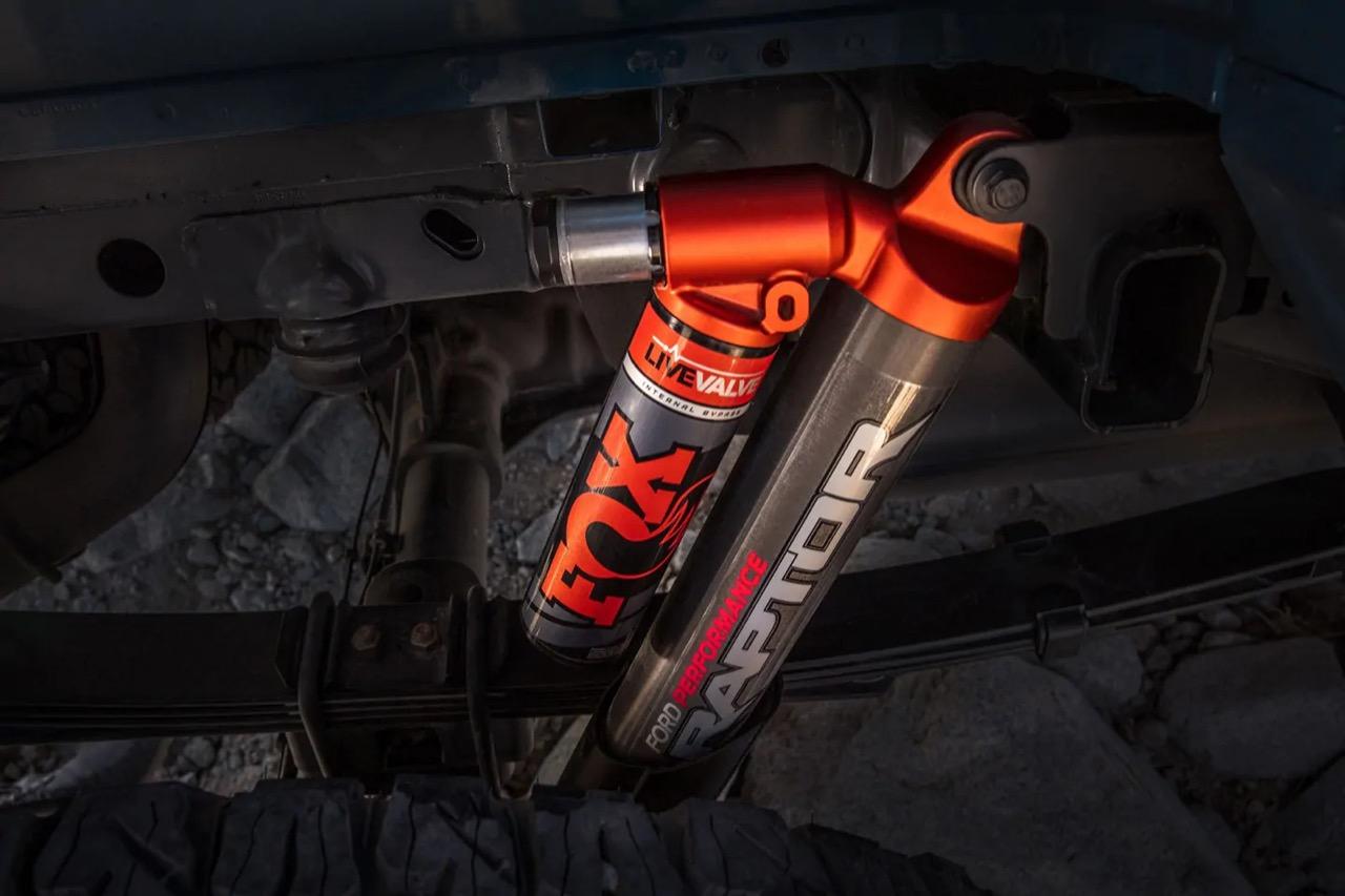 ระบบไอเสียคู่ พร้อมกลไกของวาล์วภายใน ที่ช่วยให้ตั้งค่าเสียงท่อในระดับต่างๆ ได้ เช่น Normal, Sport, quiet และโหมด Baja – ทั้งหมดนี้อธิบายได้ง่ายว่า Baja นั้น ท่อจะสนั่นเพียงใด และโหมดไหนเหมาะกับการขับเข้าหมู่บ้านในตอนดึก ระบบกันสะเทือนใช้สปริงขนาด 24 นิ้ว และเช่นเดิมกับของที่ขาดไม่ได้ นั่นก็คือโช้คประสิทธิภาพสูงของ Fox แบบ Active ที่ปรับแต่งมาเป็นพิเศษสำหรับ Raptor R วิศวกรของ Ford แจ้งว่า ล้อหน้าของ Raptor ขนาด 13 นิ้วและด้านหลังขนาด 14.1 นิ้ว พร้อมยาง A/T BF Goodrich KO2 ใช้งานได้อย่างสมบูรณ์แบบตั้งแต่ไฮเวย์ไปจนถึงทะเลทราย